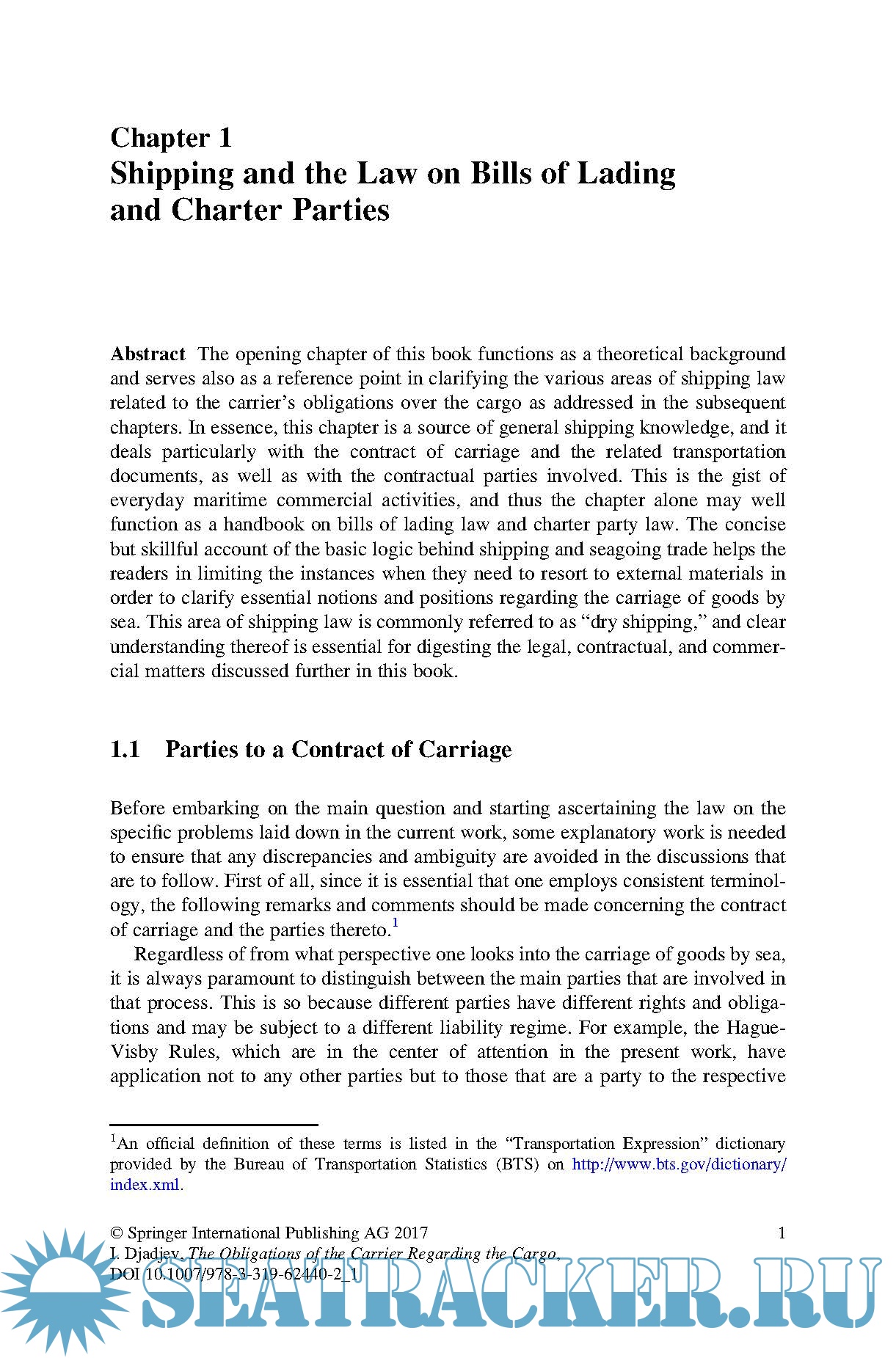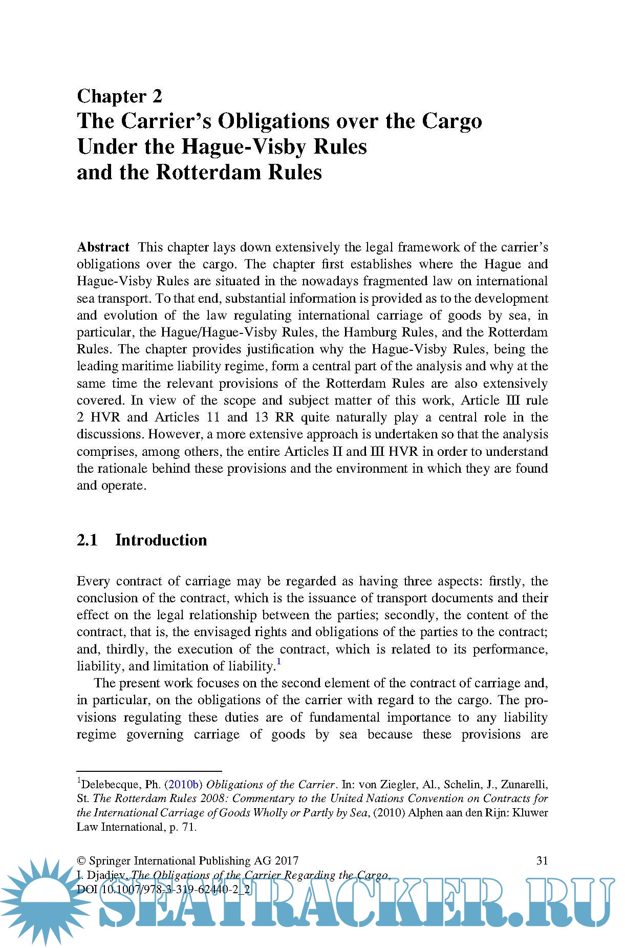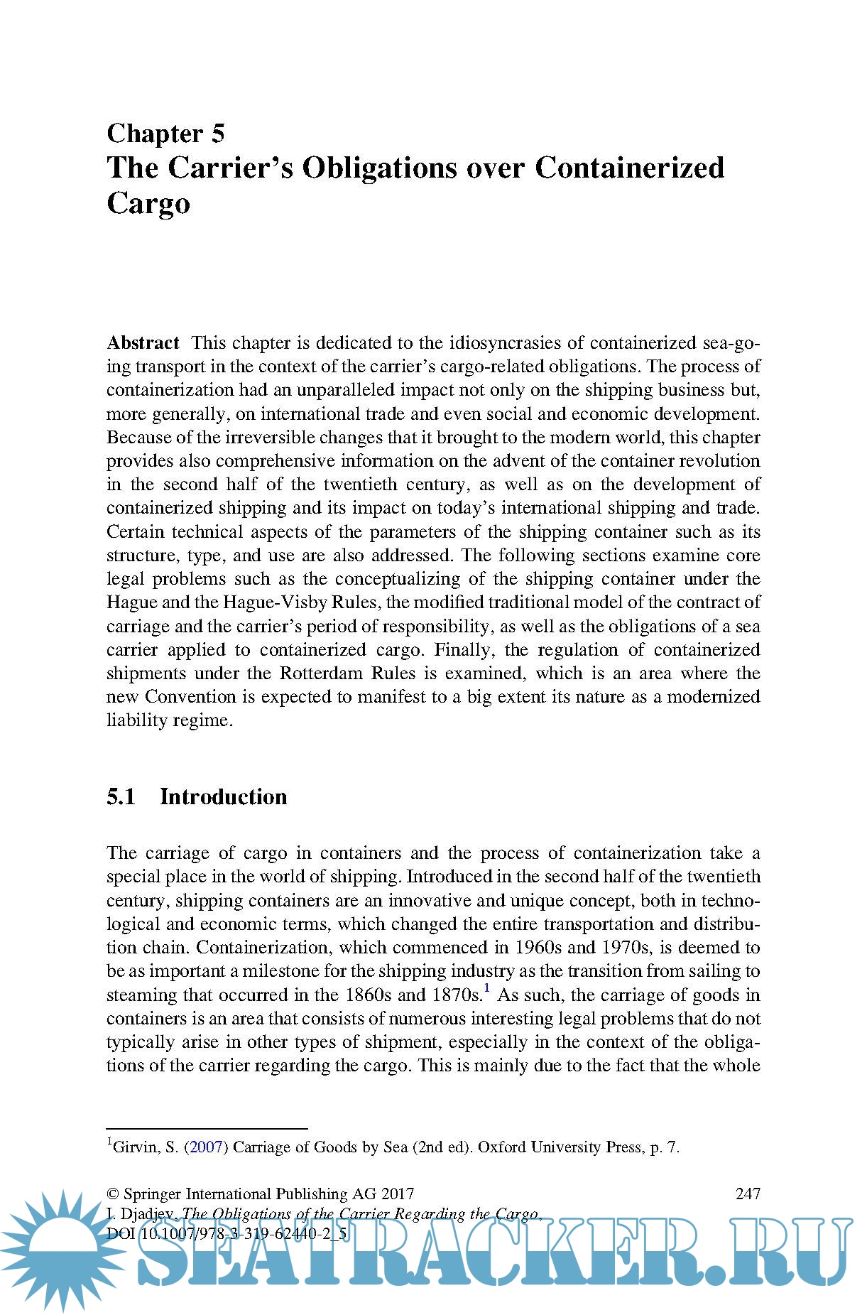 Year: 2017 Language: english Author: Ilian Djadjev Genre: Handbook Publisher: Springer ISBN: 978-3319624402 Format: PDF Quality: eBook Pages count: 343 Description: This book addresses the legal and contractual obligations of sea carriers regarding due care for the cargo under a contract of carriage. While the general framework employed is the leading international liability regime, the Hague-Visby Rules, the discussions in each chapter also account for the possible future adoption of a new regime, the Rotterdam Rules. The subject matter concerns the standard for the duty of care for goods as codified in the Hague-Visby Rules, but the work also touches upon a wide range of related topics found both in law and in practice, providing valuable commercial, technical and historical links as well as various solutions that have been found at the national and international level to address challenges arising in this specialised area of law. The book is divided into six chapters, which gradually reveal the complexity of the topic. Chapter 1 provides a thorough introduction to the two main transport documents in use, and to the basic logic behind shipping, sea-going trade and related national and international legislation. In turn, Chapter 2 presents an overview of the relevant provisions of the Hague-Visby Rules. Chapters 3, 4 and 5 examine the problems arising out of the insertion of a FIOS(T) clause in the contract of carriage; the carriage of goods on deck; and the carriage of goods in containers, respectively. Lastly, Chapter 6 provides an overall conclusion on the legal status quo and current practice, as well as future prospects. The book was written with a number of potential readers in mind and is intended to open up the topic to a broader audience. It is suitable both for readers who wish to advance their learning (e.g. professionals, practitioners and postgraduates) and for readers with little or no prior knowledge of the topic (e.g. students and researchers).