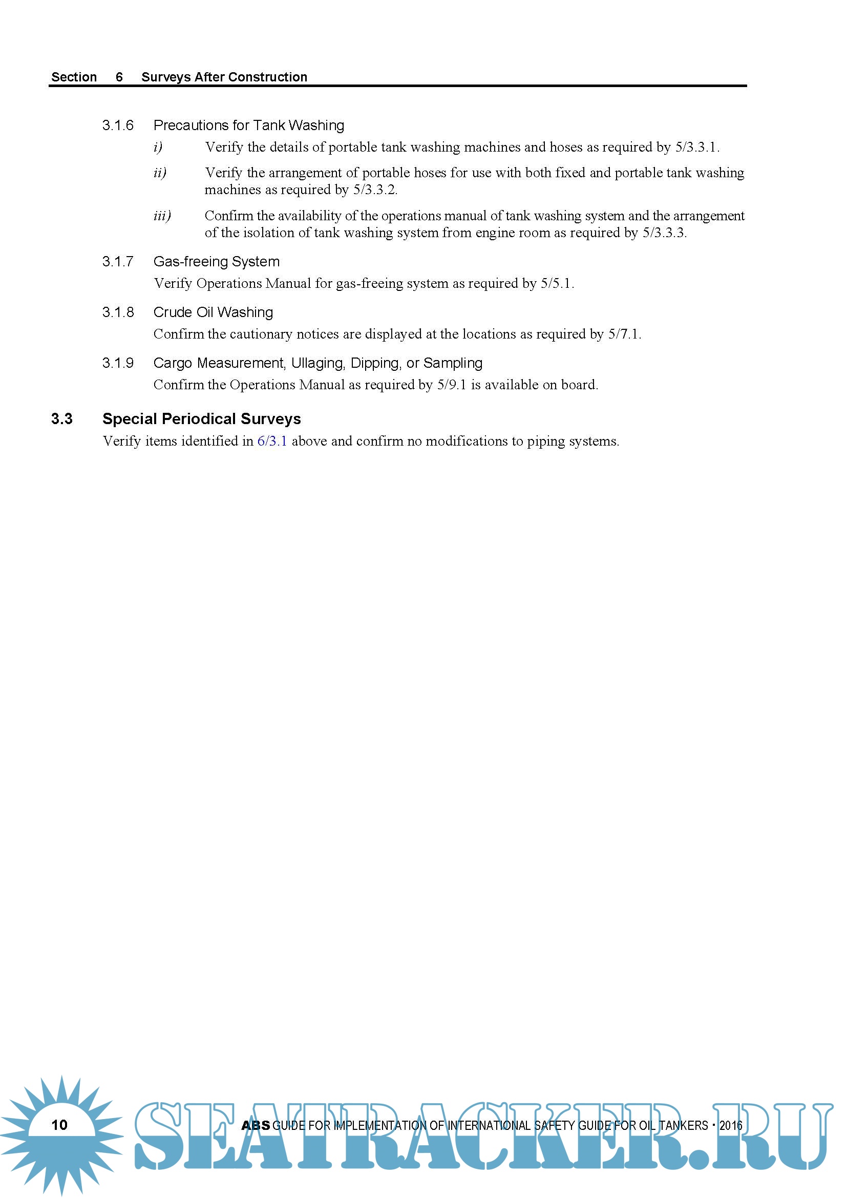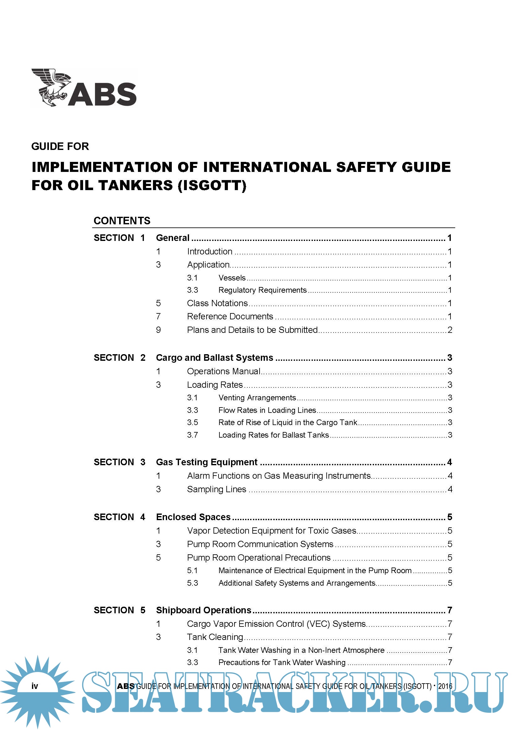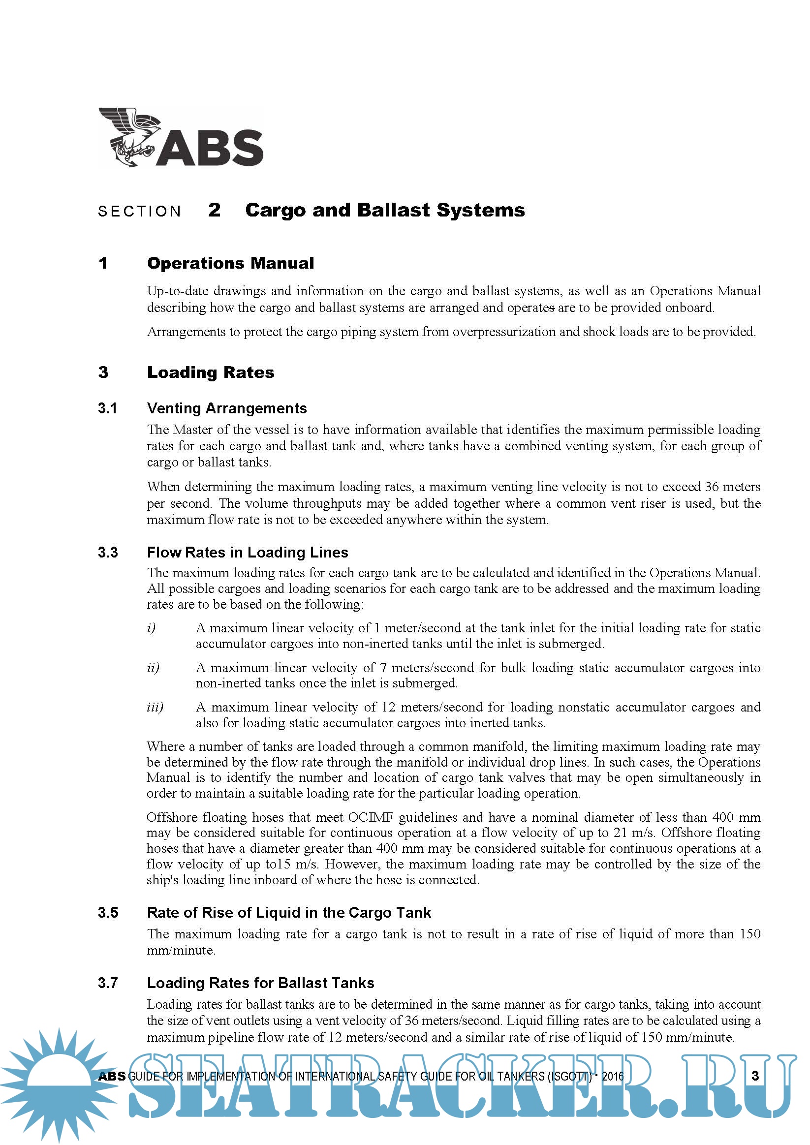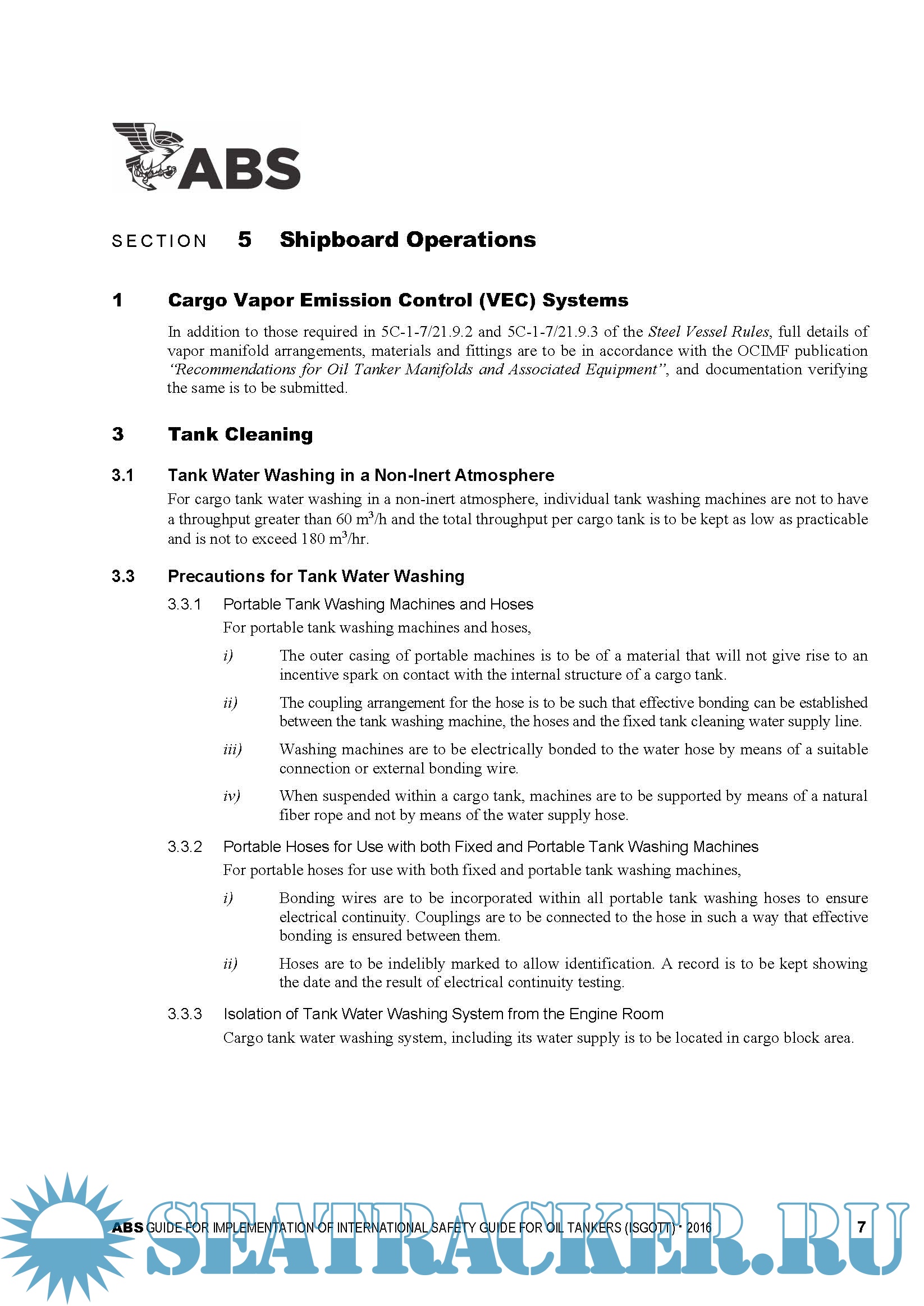 Description: In addition to the ABS Rules for Building and Classing Steel Vessels (Steel Vessel Rules) required criteria, this Guide outlines equipment and arrangement requirements that are identified in the International Safety Guide for Oil Tankers and Terminals (ISGOTT) for Oil Carriers. This Guide includes enhanced criteria for the cargo oils and associated systems such as the ballast system, gas testing equipment, cargo vapor emission control systems, tank cleaning and gas-freeing systems. However, it does not include or attempt to address operational requirements for Oil Carriers as well as the requirements for terminals identified in the International Safety Guide for Oil Tankers and Terminals (ISGOTT) for Oil Carriers.