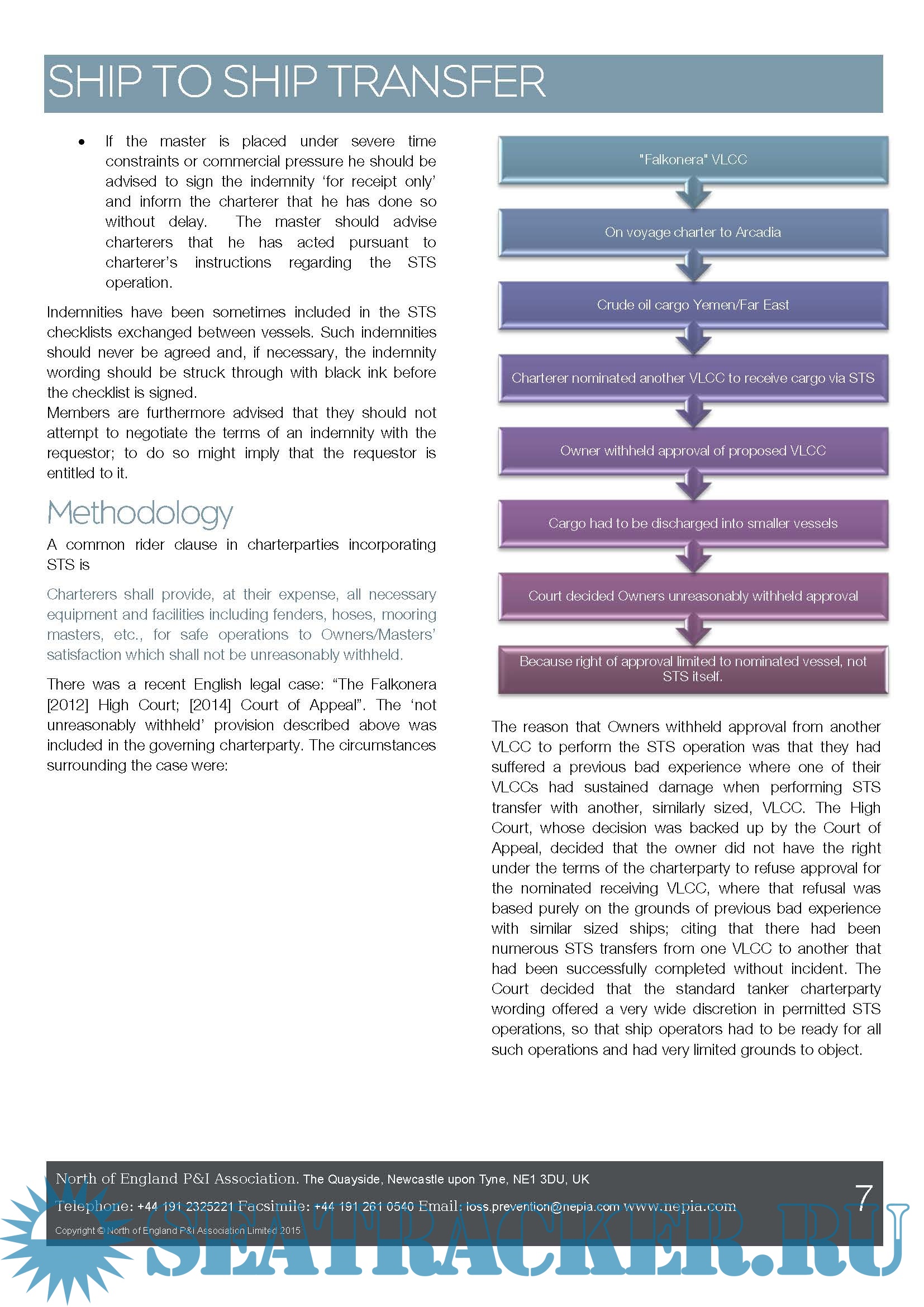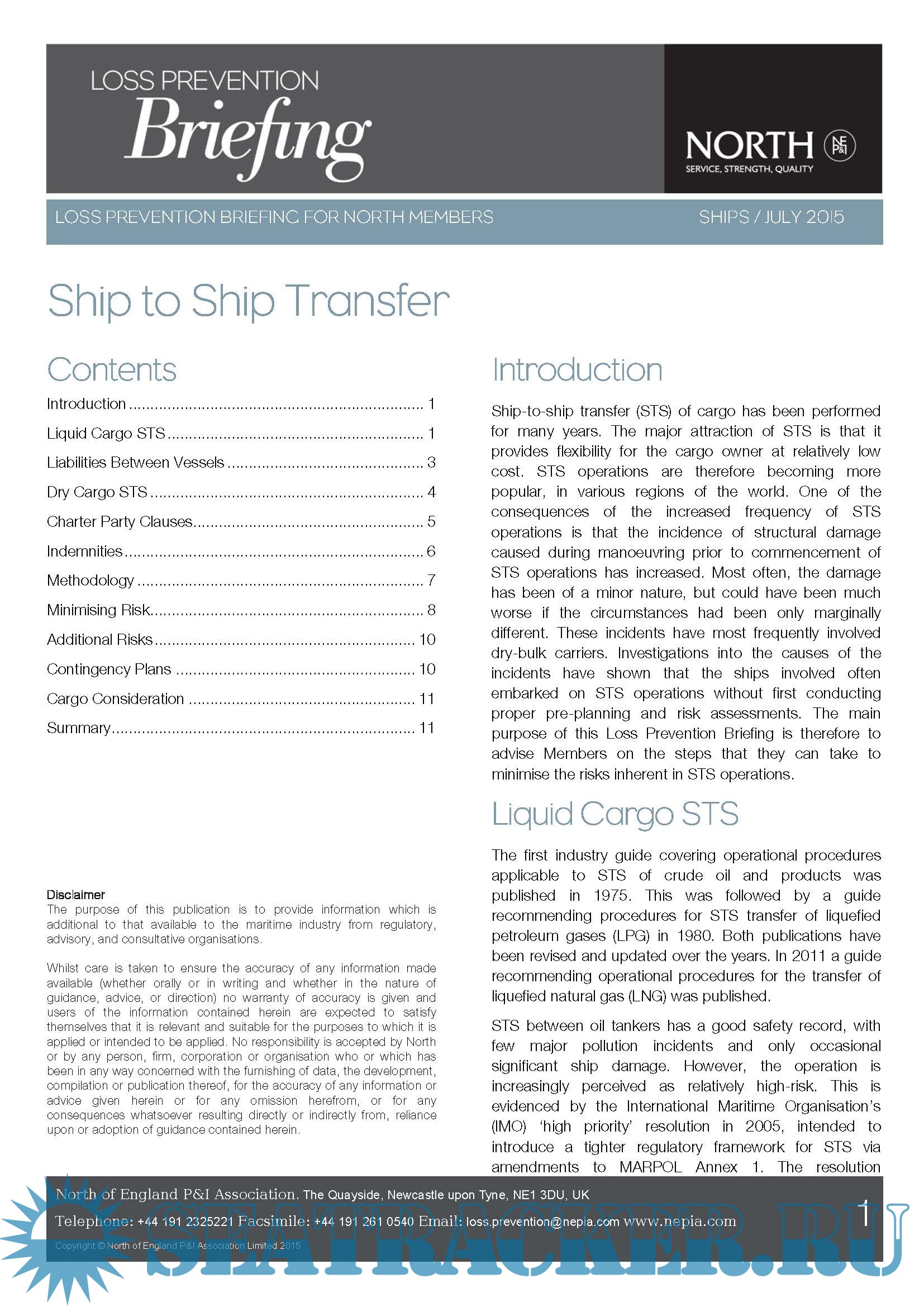 Year: 2015 Language: english Author: NE P&I Genre: Guide Format: PDF Quality: eBook Pages count: 12 Description: Ship-to-ship transfer (STS) of cargo has been performed for many years. The major attraction of STS is that it provides flexibility for the cargo owner at relatively low cost. STS operations are therefore becoming more popular, in various regions of the world. One of the consequences of the increased frequency of STS operations is that the incidence of structural damage caused during manoeuvring prior to commencement of STS operations has increased. Most often, the damage has been of a minor nature, but could have been much worse if the circumstances had been only marginally different. These incidents have most frequently involved dry-bulk carriers. Investigations into the causes of the incidents have shown that the ships involved often embarked on STS operations without first conducting proper pre-planning and risk assessments. The main purpose of this Loss Prevention Briefing is therefore to advise Members on the steps that they can take to minimise the risks inherent in STS operations.