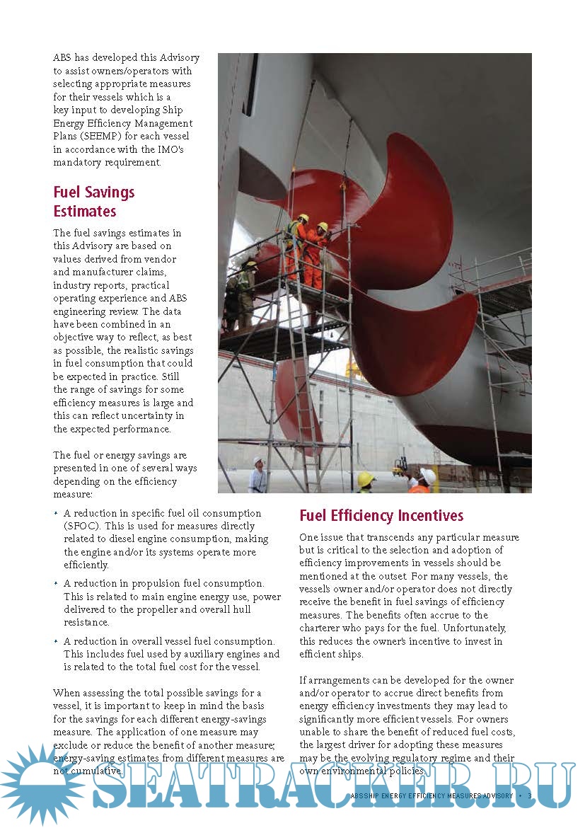 Description: This Advisory has been compiled to provide useful information on the status and the current state of ship energy efficiency measures. It provides guidance to owners and operators on the wide range of options being promoted to improve vessel efficiency, reduce fuel consumption and lower emissions. Included is background information, descriptions of the technologies, explanations of key issues, general pros/cons of each measure and limits of applicability or effectiveness, as well as practical issues related to implementation.