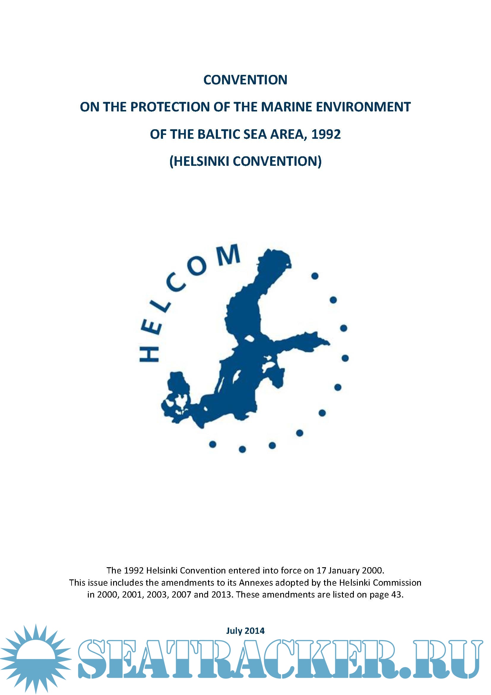Year: 2014 Language: english Author: Helsinki Commission Genre: Convention (rules) Format: PDF Quality: eBook Pages count: 44 Description: The 1992 Helsinki Convention entered into force on 17 January 2000, after the ratification instruments were deposited by the European Community, Germany, Latvia and Sweden in 1994, by Estonia and Finland in 1995, by Denmark in 1996, by Lithuania in 1997, and by Poland and Russia in November 1999. The Convention covers the whole of the Baltic Sea area, including inland waters as well as the water of the sea itself and the sea-bed. Measures are also taken in the whole catchment area of the Baltic Sea to reduce land-based pollution. The Convention is amended when deemed necessary, thus following, e.g., the developments in international environmental and maritime laws. The latest amendment entered into force on 1 July 2014.