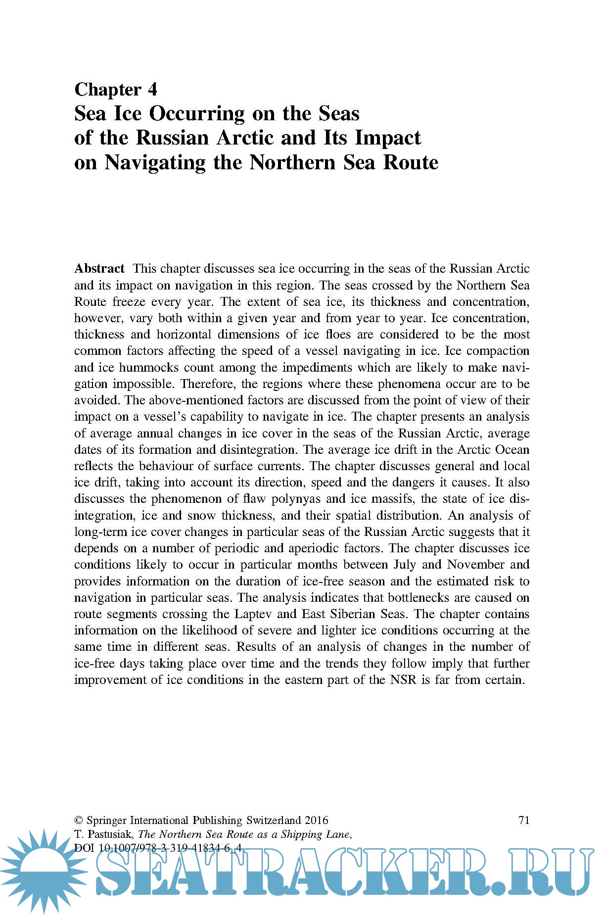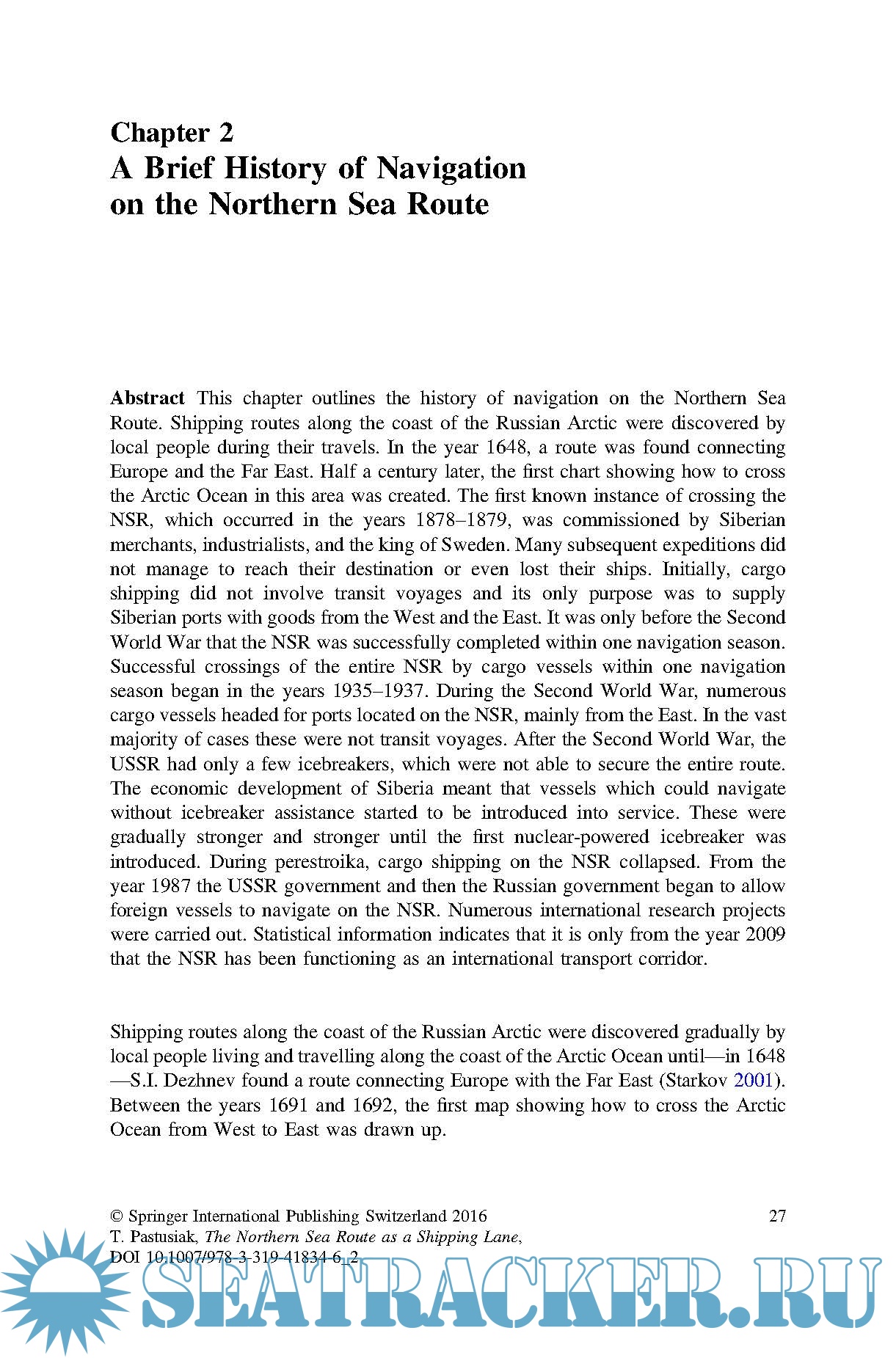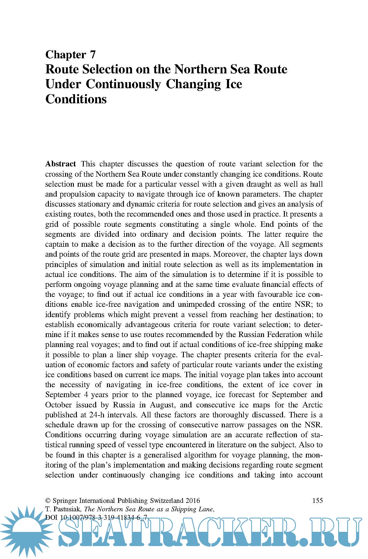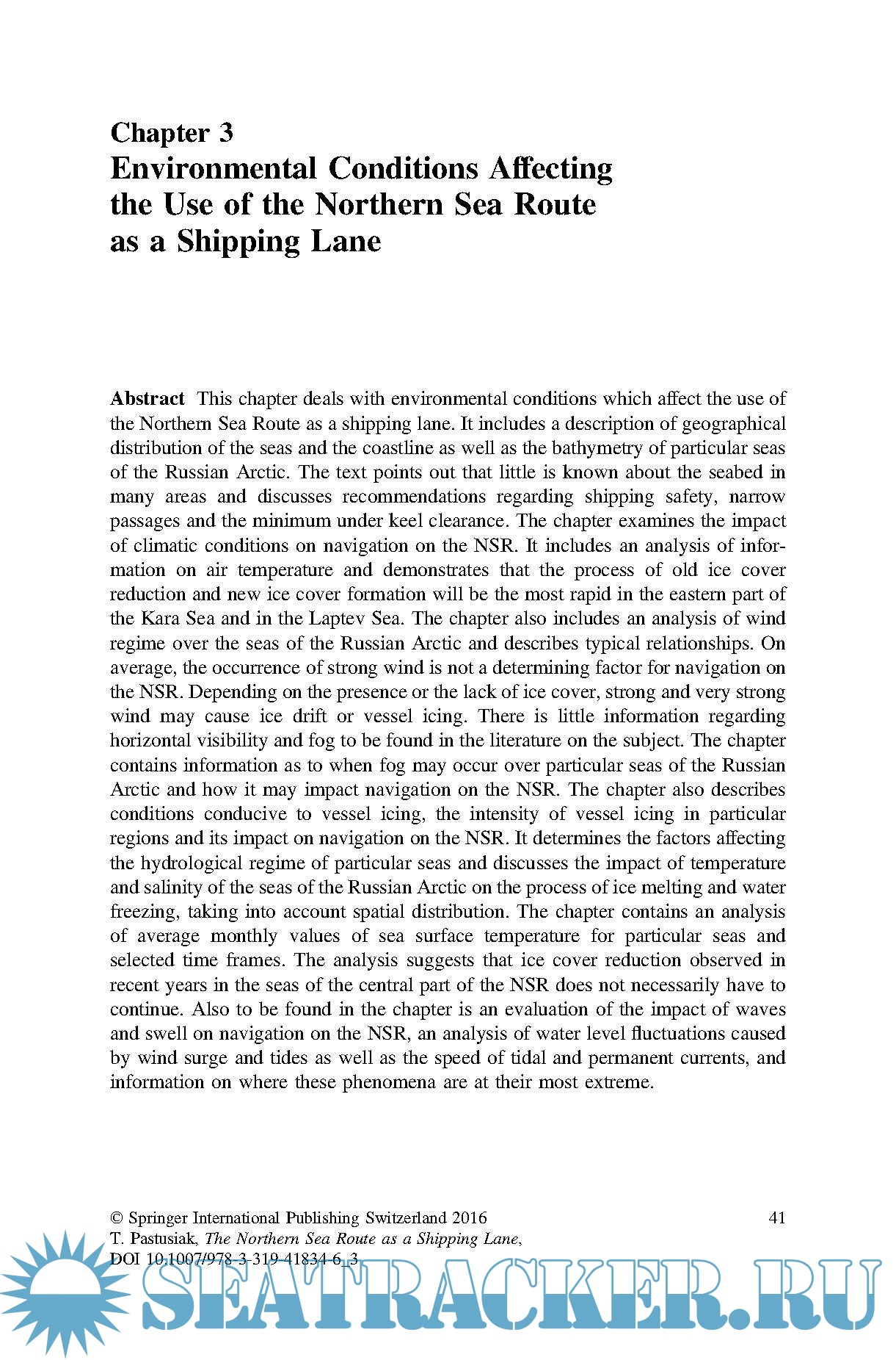Year: 2016 Language: english Author: Tadeusz Pastusiak Genre: Handbook Publisher: Springer ISBN: 978-3-319-41834-6 Format: PDF Quality: eBook Pages count: 247 Description: This book analyses the current and future viability of the Northern Sea Route as a stable transport route for the international transit traffic between Europe and the Far East. It includes the present conditions, defining and evaluating viability factors for using the Northern Sea Route (NSR). The book makes a projection for NSR in the future, taking into account the climatic change in the Arctic findings presented in the IPCC report. This study, based on the author’s PhD thesis, analyses meteorological, hydrologic, bathymetric and other data for the evaluation of the navigation criteria. It is intended for a wide spectrum of readers, from students and scientists of Earth sciences and polar geography, navigation, political science researchers and politicians interested in Arctic affairs.