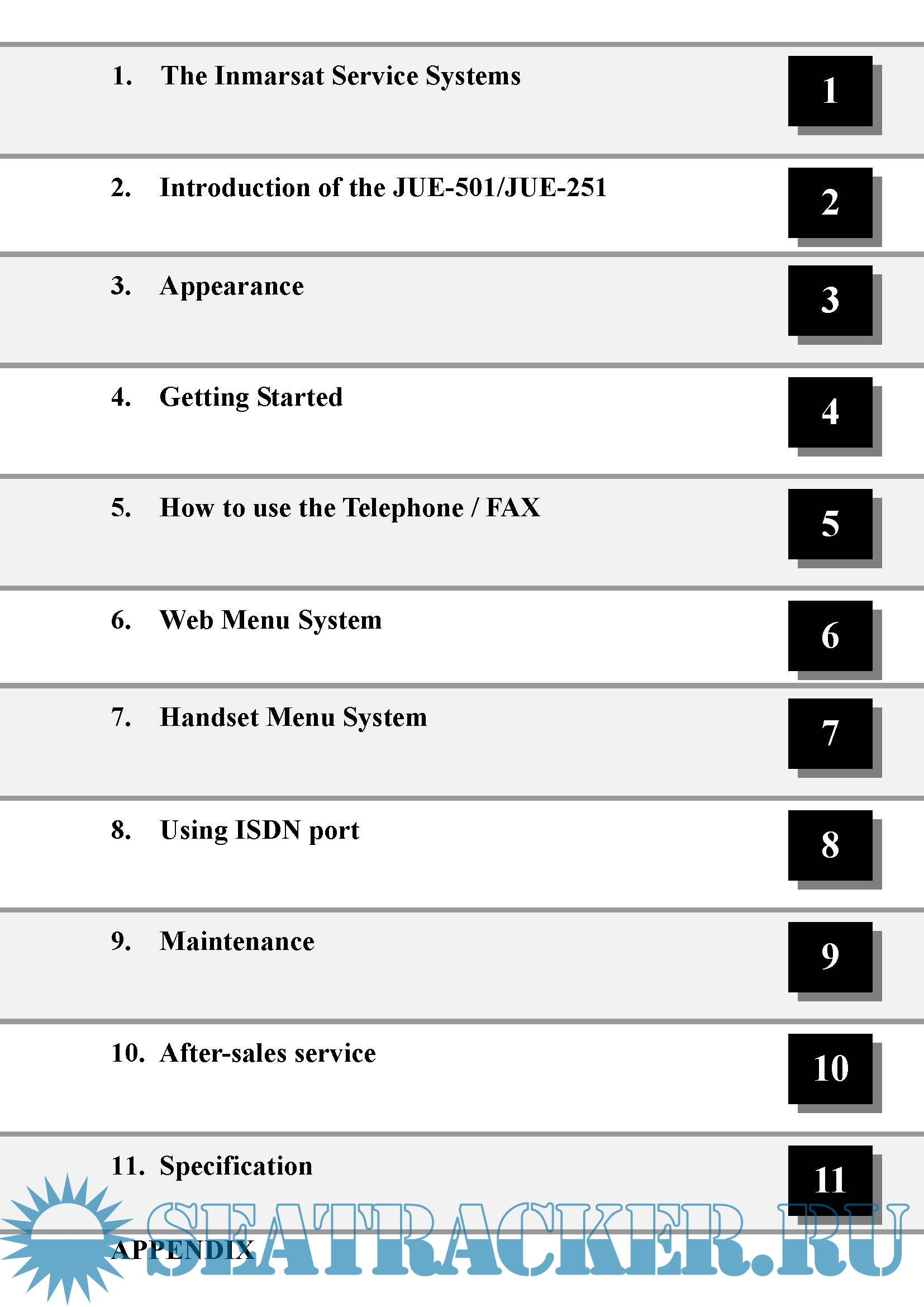 Description: JUE-501/JUE-251 is an Inmarsat digital satellite communication terminal for voice service (4kbps Voice), G3FAX and legacy analogue modem service (64kbps 3.1kHz Audio), (*)UDI/RDI, maximum 432kbps(JUE-501) or 284kbps(JUE-251) Standard IP service, 8kbps, 16kbps, 32kbps,64kbps, 128kbps and (*)256kbps Streaming IP service and Short Message Service (SMS). [(*) is available only for JUE-501.]