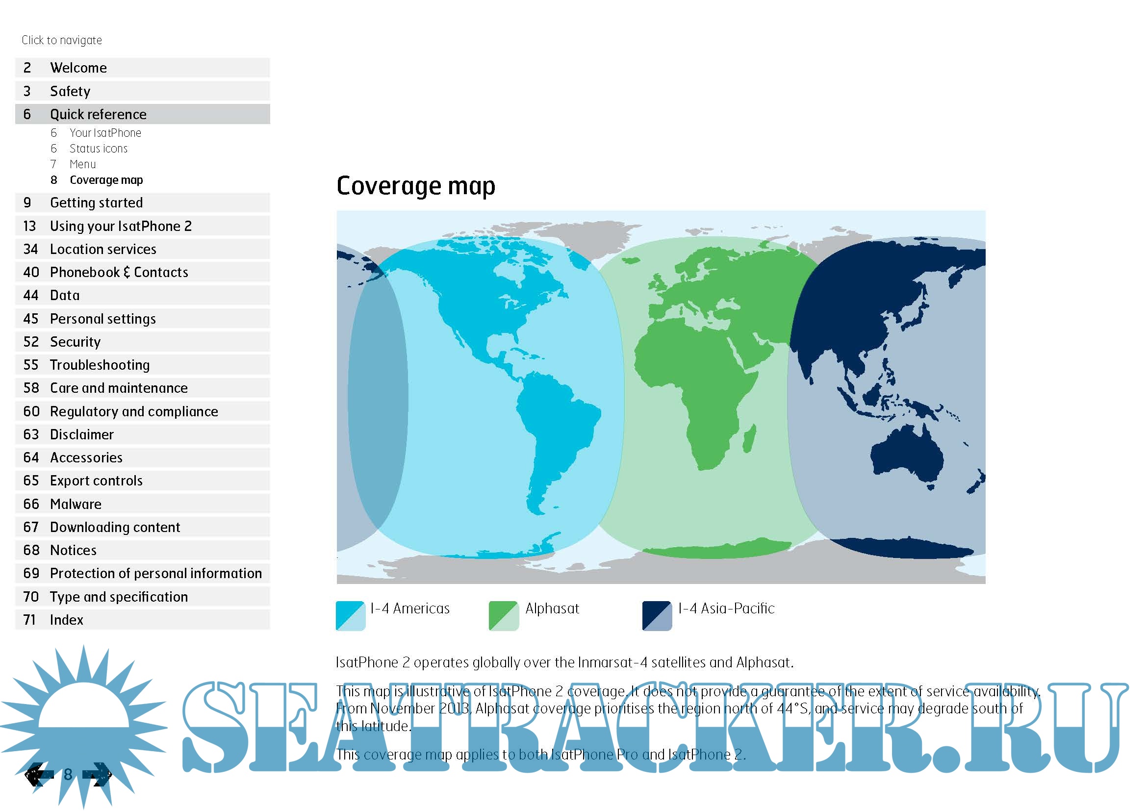 Description: IsatPhone 2 operates globally over the Inmarsat-4 satellites and Alphasat. From November 2013, Alphasat coverage prioritises the region north of 44°S, and service may degrade south of this latitude. The coverage map applies to both IsatPhone Pro and IsatPhone 2.