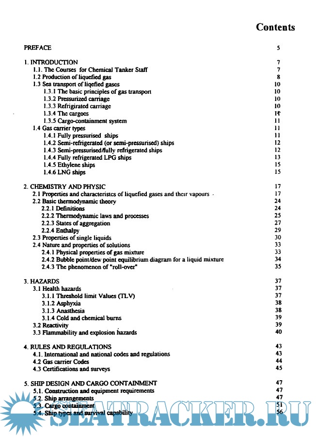 Year: 1994 Language: english Author: Edited by Jan K. Wlodarski Genre: Guide Publisher: Merchant Marine Academy, Gdynia - Poland Format: PDF Quality: Scanned pages + text layer Pages count: 197 Description: Sea transport of liquefied gases is growing to sizeable proportion and a great number of people employed on tankers. at tanker terminals ports and shipyards meet the particular problems of this trade. The IMO Conventions require adequate information on safety transport ofsuch cargo on board gas tankers. The purpose of this manual is to provide those serving on ships carrying liquefied gases with the utmost up-to-date information available on recognised good practice. thereby promoting operational safety both at sea and in port. While the recommendations may not fully cover every possible situation. they do provide the good guidance on safe procedures in such situations. The structure of the manual is based on IMO Model Course 1 .06 - Advanced Training Programme on Liquefied Gas Tanker Operation . The manual deals with operational matters. construction of the ship and equipment in relation to the safety transport of liquefied gases at sea and refers to the interrnational and national regulations detailed in chapter 4 Rules and Regulations. The manual is not to provide the full professional information to run the ship properly The manual is to draw attention of the seafarers and peoples involved in transport of liquefied gases to the hazards which presents such cargo in sea transport and necessary safety measures. Thereby one must remember about the basic principles of sea transport of dangerous cargo in bulk: Know your job Follow procedures Double check and check once again Information contained in the manual has been collected from the best available sources. checked as far as possible and given in good faith However no guarantee can be given and responsibility taken. All suggestion in order to increase the value of information given in the manual. modifications or corrections will be received with thanks. Additional info: Contributors: Czyz Stefan - chapters: 1 .1 ; 4 and 7 Dr Eng. appendices: 3. 4. 5 and 6 Sobiecki Andmej - chapters: 1 .2;1 .3 ; 2.1 ; 2.3. 2.4 and 3 Dr Eng. Wlodarski Jan K. - chapters 1 .4; 2.2: 5 and 6 Prof DSc. Eng. appendices: 1 . 2 and 9 Byczynski Zbigniew - chapters 8 and 9 Master Mariner, Eng appendices 7 and 8 Proof reader - Angonina Brozyna M.A. Consultant - Prof. Rudiger Bohlhoff- Hochschule fur Seefahrt - Leer. Germany. The book has been elaborated and produced in Merchant Marine Academy - Gdynia, Poland in frame of Tempus Project JEP 3010 "Modernisation of educational system in view of marine environment protection"