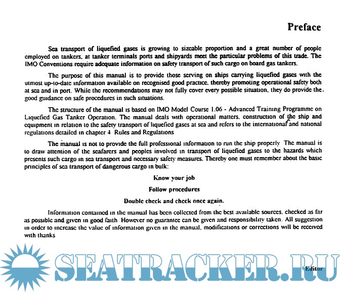 The manual is not to provide the full professional information to run the ship properly The manual is to draw attention of the seafarers and peoples involved in transport of liquefied gases to the hazards which presents such cargo in sea transport and necessary safety measures. Thereby one must remember about the basic principles of sea transport of dangerous cargo in bulk: