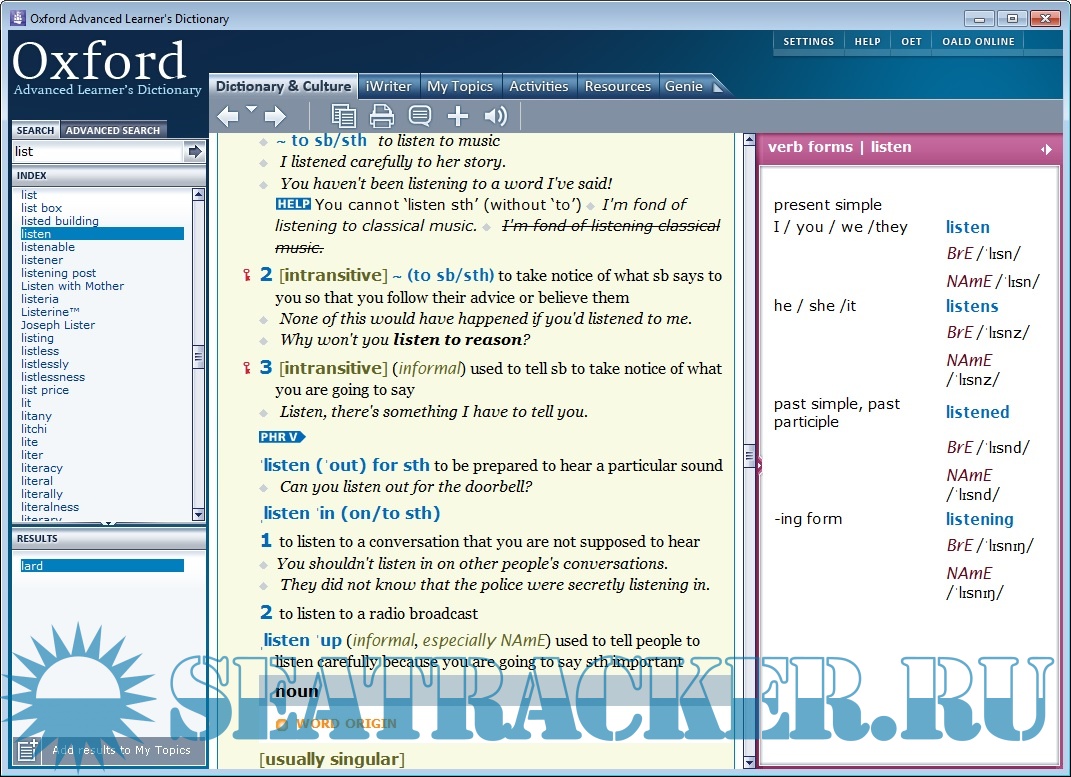 Year: 2010 Language: english Author: Oxford University Press Genre: Dictionary Format: EXE Quality: Unknown Pages count: 1796 Description: The world’s best-selling advanced-level dictionary for learners of English Over 100 million English language learners have used the Oxford Advanced Learner’s Dictionary (OALD) to develop their English skills for work and study. It is a world bestseller, trusted for its clear explanations and example sentences. Use OALD to understand what words mean, learn how to say them, and know how to use them: Find any word: either search or double click words in entries to look them up Improve pronunciation: with British and American pronunciation of all words Understand meanings: entries are written using only the Oxford 3000™ key words Additional info: Лучший толковый словарь по английскому языку что я видел ! После установки надо заменить exe файл на тот что в папке crack