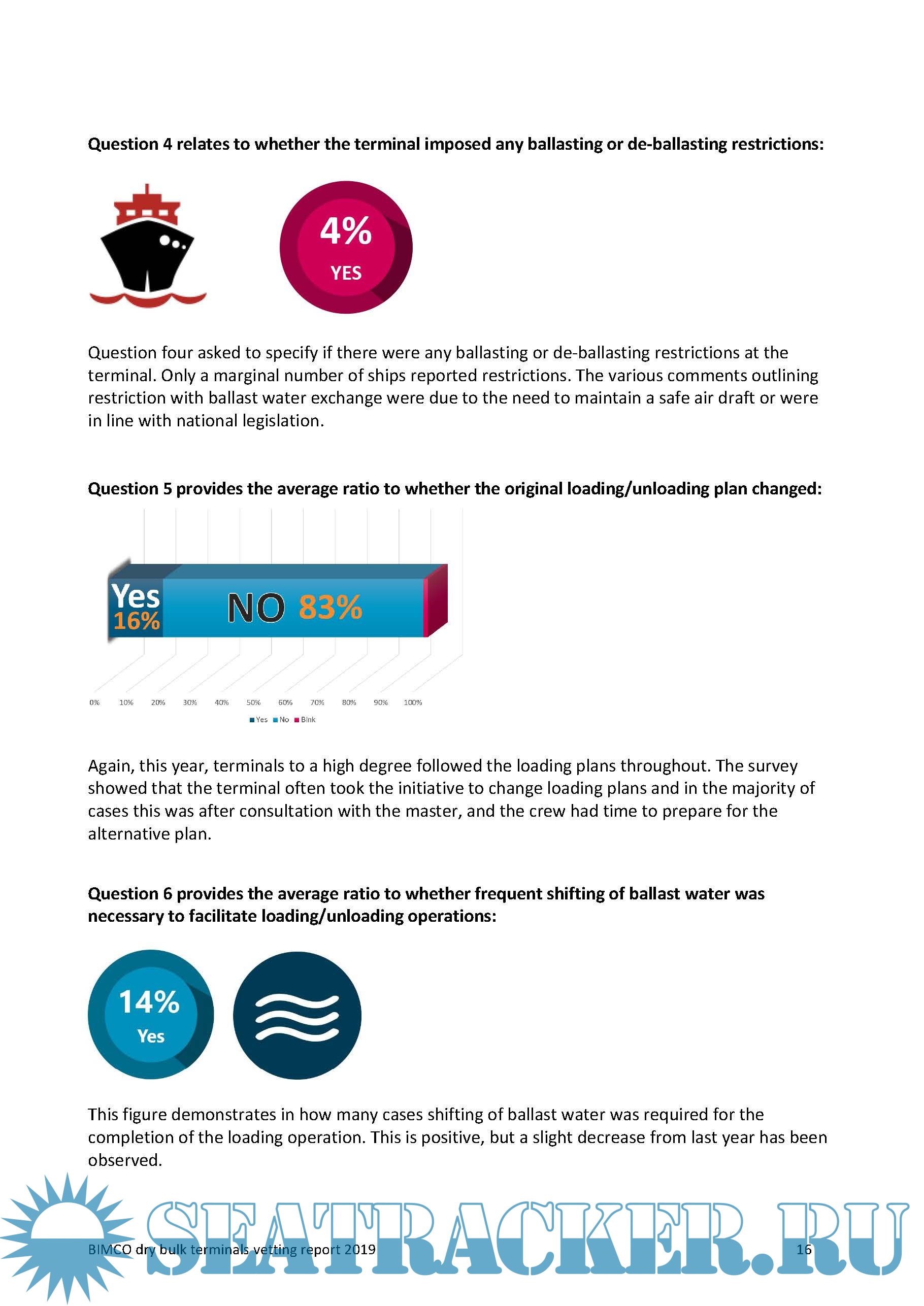 Description: BIMCO launched its Dry Bulk Terminals Vetting scheme on 19 January 2015. The answers received from the vetting questionnaire are used to create a database on port/terminal practices that will be used for statistical purposes and the rating of terminals. The collected data gives a quick overview of the dry bulk terminal’s performance. It can be used as guidance for planning future calls at terminals around the world. Shipping companies will, for example, be able to find out if other ships have experienced damage, operational difficulties or surges at a particular terminal.