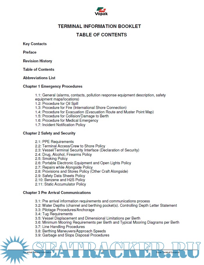 Year: 2019 Language: english Author: Vopak Genre: Handbook Format: PDF Quality: eBook Pages count: 62 Description: This Terminal information Manual is addressed to masters, owners, operators, and agents of all vessels calling at the Vopak Terminal in Rotterdam Europort designated on the front of the Manual. The master, owner and operator of the vessel calling at the Designated Terminal are responsible for: (a) the condition of the vessel, (b) the safe conduct of all operations on board the vessel, (c) compliance with all federal, state and local laws, rules and regulations, and (d) compliance with all rules and regulations in the Manual. Vessels are required to maintain copies of this Manual on board the vessel, with all notices and amendments fully accessible to all crewmembers, owner’s and operator’s personnel and/or appointed agents.