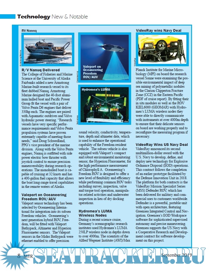 Description: Marine Technology Reporter magazine is the world's largest audited circulation publication serving the global Marine Technology Market. From offshore energy to subsea defense to science and technology, MTR covers it all.Each issue is packed with the latest cutting edge technology from the industry’s leading companies, as well as exclusive insights and market analysis that are critical in today's subsea industry.If it is subsea industry related technology you seek, you will find it in Marine Technology Reporter Magazine.Audited By BPA