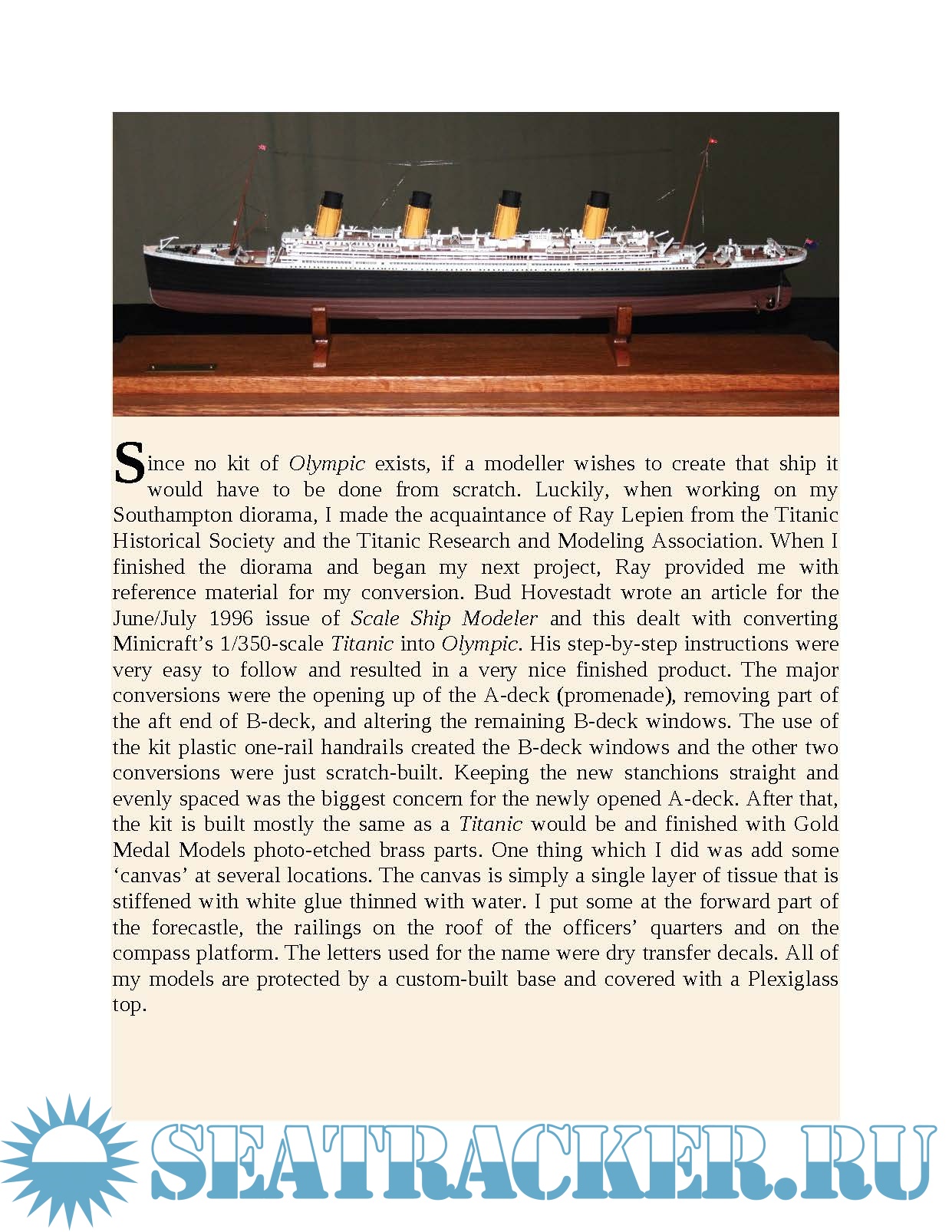 Year: 2011 Language: english Author: Peter Davies-Garner Genre: Handbook Publisher: Seaforth Publishing ISBN: 978 1 78383 073 2 Format: PDF Quality: eBook Pages count: 155 Description: The ShipCraft series explores the iconic pleasure vessels Titanic, Olympic, and Britannic in fully illustrated detail for building your own model ship. In the first of the ShipCraft series to cover non-naval vessels, this meticulously researched and illustrated volume looks at the legendary cruise ship RMS Titanic and her sisters, Olympic and Britannic. Written for the serious model ship builder, this book not only covers the many model kits available, but a concise history of the ship’s class, including every detail that contributed to the ship’s creation. Accompanied by hundreds of photographs of models in various scales, the text covers paint colours, line drawings, and scale plans, as well as the differences in the ships’ appearance over time. An invaluable resource on available models, their pros and cons, and ways to modify and customize each one, this ShipCraft title concludes with a reference section essential to any modeller.