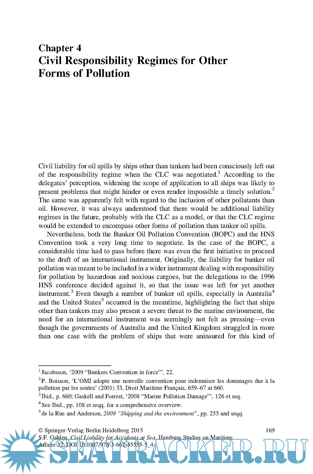 Although there is an international legal framework that covers the most frequent types of cases, questions remain regarding the interplay of international and national legislation. Addressing those questions, the first part of this study analyses the rules and the limits of international regulation applicable at sea, namely regarding compensation for pollution damage. The second part focuses on the jurisdictional rules and conflict-of-law rules that may be used to deal with cases beyond the scope of international legislation, in accordance with the law of the sea.