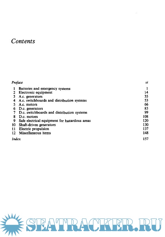 CONTENTS INCLUDE; Preface; Batteries and emergency systems; Electronic equipment; A.C. alternators; A.C. switchboards and distribution systems; A.C. motors; D.C. generators; D.C. switchboards and distribution systems; D.C. motors; Safe electrical equipment for hazardous areas; Shaft-driven generators; Electric propulsion; Miscellaneous items; Index.