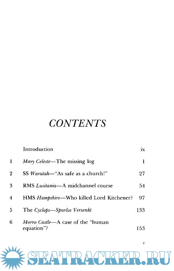 He tries to answer what happened to them, and if they were really lost at sea. The eight case examined are Mary Celeste, Waratah, Lusitania, HMS Hampshire, Cyclops, Morro Castle, Scorpion, and Poet.
