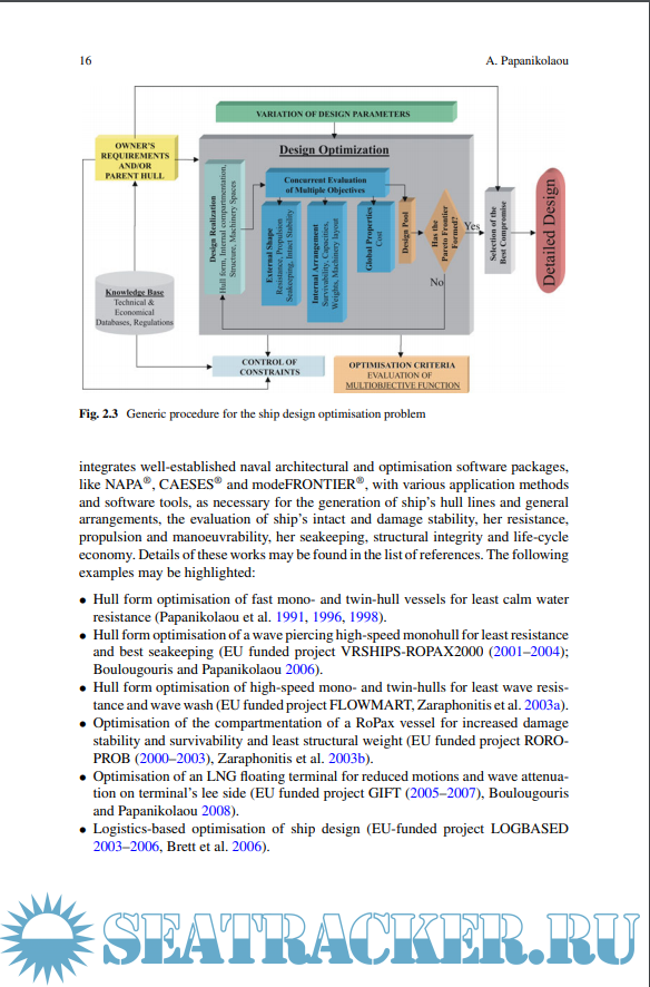 Year: 2019 Language: english Author: Apostolos Papanikolaou Genre: - Publisher: Springer International Publishing Edition: 1st ISBN: 978-3-030-02810-7 Format: PDF Quality: eBook Pages count: 501 Description: This book introduces a holistic approach to ship design and its optimisation for life-cycle operation. It deals with the scientific background of the adopted approach and the associated synthesis model, which follows modern computer aided engineering (CAE) procedures. It integrates techno-economic databases, calculation and multi-objective optimisation modules and s/w tools with a well-established Computer-Aided Design (CAD) platform, along with a Virtual Vessel Framework (VVF), which will allow virtual testing before the building phase of a new vessel. The resulting graphic user interface (GUI) and information exchange systems enable the exploration of the huge design space to a much larger extent and in less time than is currently possible, thus leading to new insights and promising new design alternatives. The book not only covers the various stages of the design of the main ship system, but also addresses relevant major onboard systems/components in terms of life-cycle performance to offer readers a better understanding of suitable outfitting details, which is a key aspect when it comes the outfitting-intensive products of international shipyards. The book disseminates results of the EU funded Horizon 2020 project HOLISHIP.