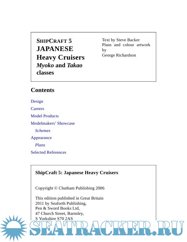 Year: 2006 Language: english Author: Backer S. Genre: History Publisher: Seaforth Publishing ISBN: 978-1848321076 Format: PDF Quality: Scanned pages Pages count: 64 Description: The ‘ShipCraft’ series provides in-depth information about building and modifying model kits of famous warship types. Lavishly illustrated, each book takes the modeler through a brief history of the subject class, highlighting differences between sister-ships and changes in their appearance over their careers. This includes paint schemes and camouflage, featuring color profiles and highly-detailed line drawings and scale plans. The modeling section reviews the strengths and weaknesses of available kits, lists commercial accessory sets for super-detailing of the ships, and provides hints on modifying and improving the basic kit. This is followed by an extensive photographic gallery of selected high-quality models in a variety of scales, and the book concludes with a section on research references – books, monographs, large-scale plans and relevant websites. This volume is devoted to the largest cruisers in the Imperial Japanese Navy. Built in defiance of treaty restrictions, they were the fastest and most powerful heavy cruisers of their day, and were heavily engaged in every campaign from Pearl Harbor to the end of the Pacific War.