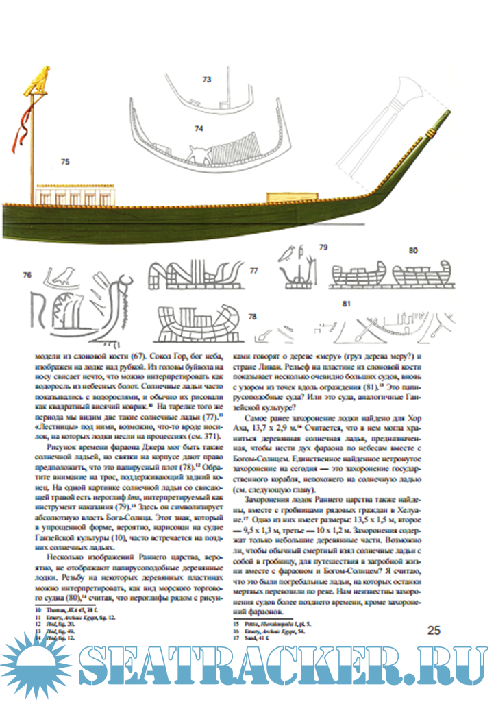 Описание: «Они проделали отверстие в одном из блоков, заглянули внутрь и обнаружили части лодки: руль, весла, тяжелые доски, шесты, пиллерсы, бимсы и дверцы». Это произошло, когда в Гизе, возле Каира, в 1952 г. был найден гигантский строительный набор древнеегипетского судна,