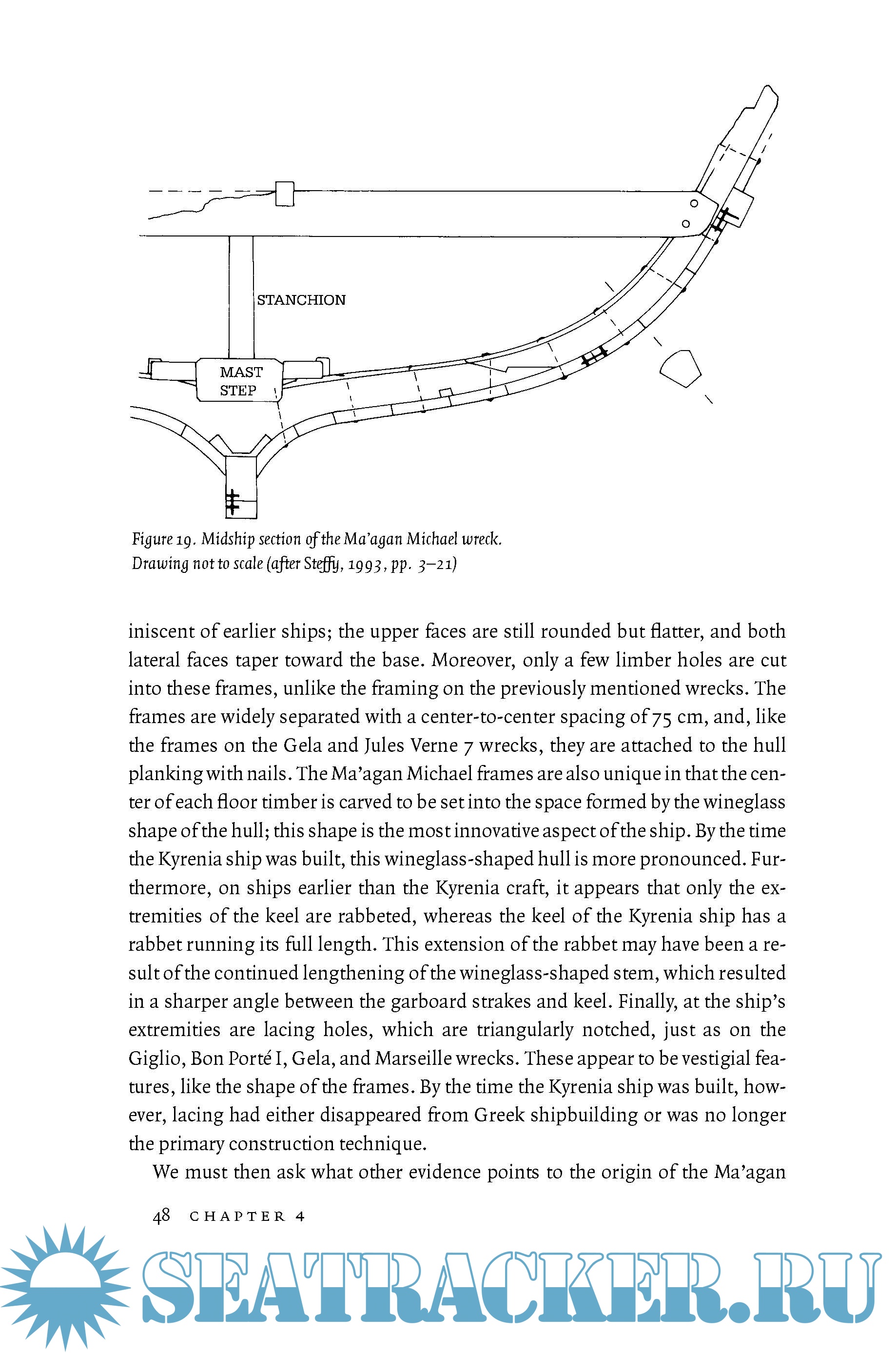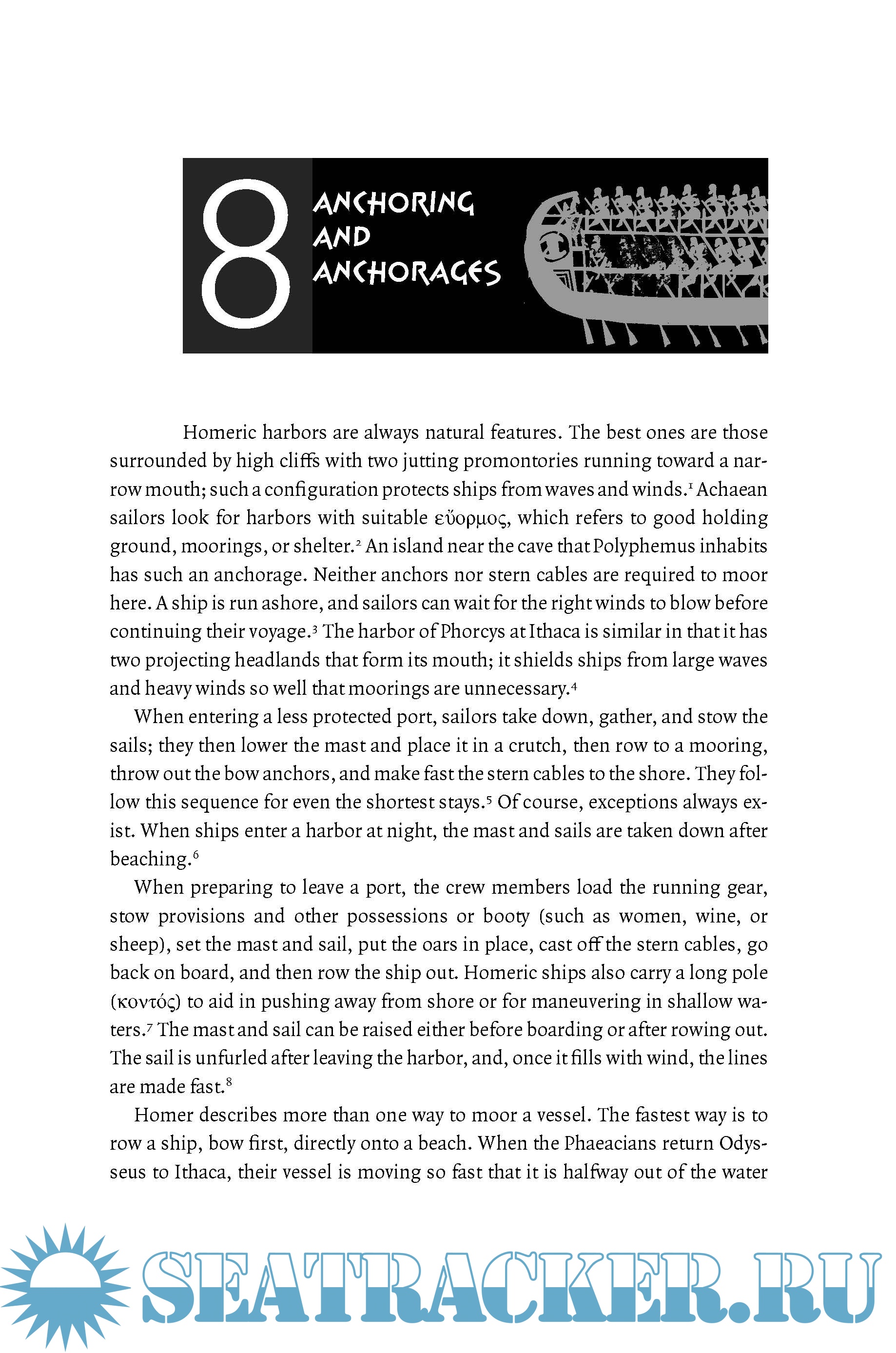 Mark begins by emphasizing the importance of the household during a period in which chiefs ruled and Greek nobles disdained merchants and considered seafaring a necessary but less than distinguished activity. His chapter on Odysseus’s construction of a ship includes discussions of the types of wood used. He concludes that most Greek ships were of laced, rather than pegged mortise-and-tenon construction. Mark goes on to discuss characteristics of Homeric ships and their stern ornaments, oars, quarter rudders, masts, mast-steps, keels, ropes, cables, and planks.