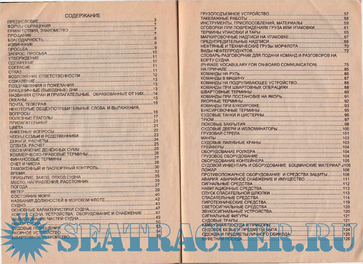 ПРЕДИСЛОВИЕ.....................................................................................................3 ФОРМЫ ОБРАЩЕНИЯ..........................................................................................7 ПРИВЕТСТВИЯ, ЗНАКОМСТВО...........................................................................7 ПРОЩАНИЕ.........................................................................................-■.................7 БЛАГОДАРНОСТЬ.................................................................................................8 ИЗВИНЕНИЕ..........................................................................................................а ПРОСЬБА...............................................................................................................9 ЗАПРОС, ПРОСЬБА............................................................................................10 УТВЕРЖДЕНИЕ...................................................................................................11 ОДОБРЕНИЕ........................................................................................................11 СОГЛАСИЕ..........................................................................................................11 ОТКАЗ...................................................................................................................11 ВОЗЛОЖЕНИЕ ОТВЕТСТВЕННОСТИ...............................................................12 СОЖАЛЕНИЕ.......................................................................................................13 ПОЗДРАВЛЕНИЯ И ПОЖЕЛАНИЯ.....................................................................13 ПРАЗДНИЧНЫЕ (ВЫХОДНЫЕ) ДНИ.................................................................13 НАЗВАНИЯ СТРАН И ПРИЛАГАТЕЛЬНЫЕ, ОБРАЗОВАННЫЕ ОТ НИХ........14 ОКЕАНЫ...............................................................................................................15 ПОЧТА, ТЕЛЕГРАФ.............................................................................................15 НЕКОТОРЫЕ ОБЩЕУПОТРЕБИТЕЛЬНЫЕ СЛОВА И ВЫРАЖЕНИЯ, ВОПРОСЫ............................................................................................................16 ПОЛЕЗНЫЕ ГЛАГОЛЫ........................................................................................17 ПРИЛАГАТЕЛЬНЫЕ...........................................................................................21 ЦВЕТА..................................................................................................................21 АНКЕТНЫЕ ВОПРОСЫ.......................................................................................22 ЧЛЕНЫ СЕМЬИ И РОДСТВЕННИКИ..................................................................23 ДЕНЬГИ, РАСЧЕТЫ.............................................................................................24 ОПЛАТА, РАСЧЕТ...............................................................................................25 ОБОЗНАЧЕНИЕ ДЕНЕЖНЫХ СУММ.................................................................25 КОММЕРЧЕСКО-ПРАВОВЫЕ ТЕРМИНЫ..........................................................26 ФИНАНСОВЫЕ ТЕРМИНЫ.................................................................................27 СЧЕТ И ЧИСЛА....................................................................................................28 ТАМОЖЕННЫЙ И ПАСПОРТНЫЙ КОНТРОЛЬ.................................................30 ВРЕМЯ..................................................................................................................32 ПРИБЫТИЕ, ЗАХОД, ОТХОД СУДНА ................................................................35 МЕСТО, НАПРАВЛЕНИЯ, РАССТОЯНИЕ.........................................................36 ПОГОДА...............................................................................................................37 ВЕТЕР...................................................................................................................39 СОСТОЯНИЕ МОРЯ............................................................................................40 НАЗВАНИЯ ДОЛЖНОСТЕЙ В МОРСКОМ ФЛОТЕ............................................42 СУДНО..................................................................................................................43 ОСНОВНЫЕ ХАРАКТЕРИСТИКИ СУДНА..........................................................47 КОРПУС СУДНА УСТРОЙСТВА, ОБОРУДОВАНИЕ И СНАБЖЕНИЕ...........47 НАИМЕНОВАНИЕ ЧАСТЕЙ СУДНА..................!................................................49 НАБОР СУДНА.....................................................................................................50 СУДОВЫЕ ПОМЕЩЕНИЯ...................................................................................52 ЯКОРНОЕ УСТРОЙСТВО...................................................................................54 ШВАРТОВНОЕ УСТРОЙСТВО...........................................................................55 ГРУЗОПОДЪЕМНОЕ УСТРОЙСТВО..................................................................57 ТАКЕЛАЖНЫЕ РАБОТЫ...................................................