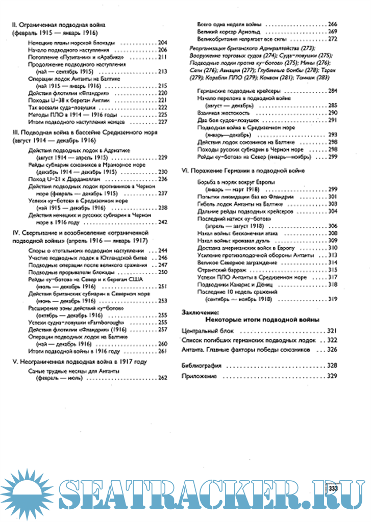 Кроме того, книга содержит подробное описание боевых действий подводных лодок обеих враждебных группировок в морях вокруг Европы. Рассказывая о Мировой войне на море, особое внимание автор уделяет изложению и анализу событий, связанных с тотальным подводным наступлением германского подводного флота на коммерческое судоходство, а также с борьбой союзников против `y - ботов`.