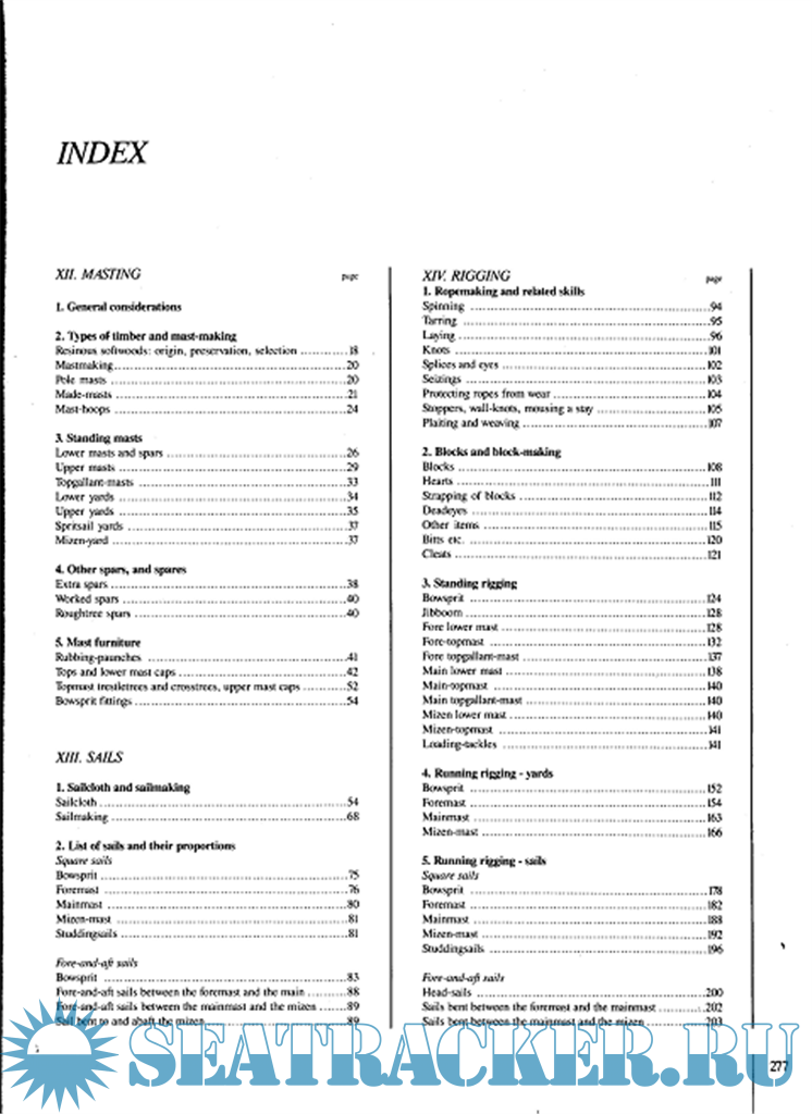 XII Мачты. Основные данные. Тип применяемого дерева и изготовление мачт. Установка и крепление мачт. Другой рангоут и запасные части. Мачтовые детали (марсы, краспицы, салинги, эзельгофты и т.д.).XIII Паруса. Парусина и изготовление парусов. Список парусов и их размеры.