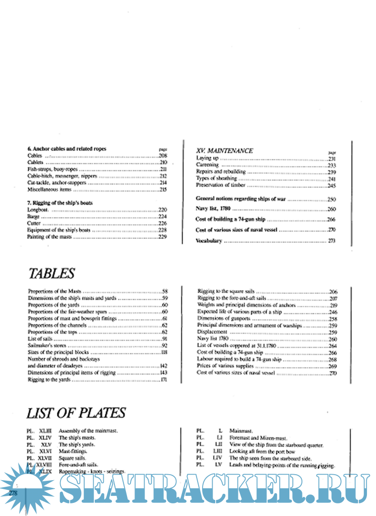 XII Мачты. Основные данные. Тип применяемого дерева и изготовление мачт. Установка и крепление мачт. Другой рангоут и запасные части. Мачтовые детали (марсы, краспицы, салинги, эзельгофты и т.д.). XIII Паруса. Парусина и изготовление парусов. Список парусов и их размеры. XIV. Такелаж. Изготовление тросов. Блоки. Стоячий такелаж. Бегучий такелаж рей. Бегучий такелаж парусов. Якорные канаты и относящиеся к ним элементы. Такелаж шлюпок. XV. Техническое обслуживание и ремонт. Некоторые главные замечания относительно военных кораблей. Список кораблей французского флота в 1780 году. Стоимость постройки 74-х пушечного и других кораблей. Список чертежей: - Сборка грот-мачты. - Мачты и бушприт. - Реи. - Мачтовые детали. - Прямые паруса. - Косые паруса. - Изготовление каната. Узлы. Сплетение тросов. - Стоячий такелаж грот-мачты. - Стоячий такелаж фок-мачты и бизани. - Проводка и крепление на верхней палубе ходовых концов бегучего такелажа. - Вид на корабль с правого борта (цветн.) - Вид на корабль с левого борта (цветн.)