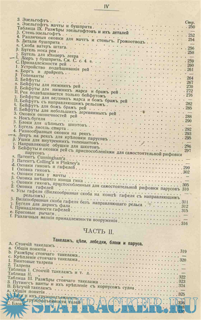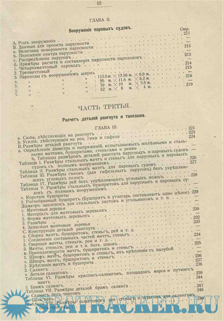 Во второй и третьей частях ее представлены, как чертежи, так и расчеты разных типов судов, (именно: водоизмещения, положений центра величины, метацентра и др.) их деталей рангоута и парусности.