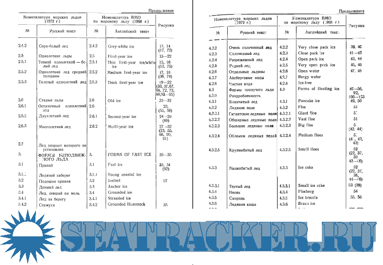 Во второй части приведены в тематическом порядке, с их номенклатурными номерами, термины отечественной номенклатуры морских льдов и соответствующие термины (на английском языке) номенклатуры ВМО. Указаны номера рисунков, иллюстрирующих тот или иной термин. При этом кроме основных рисунков в скобках указаны дополнительные, которые могут быть привлечены для более полного представления о внешнем виде какого-либо образования или явления.