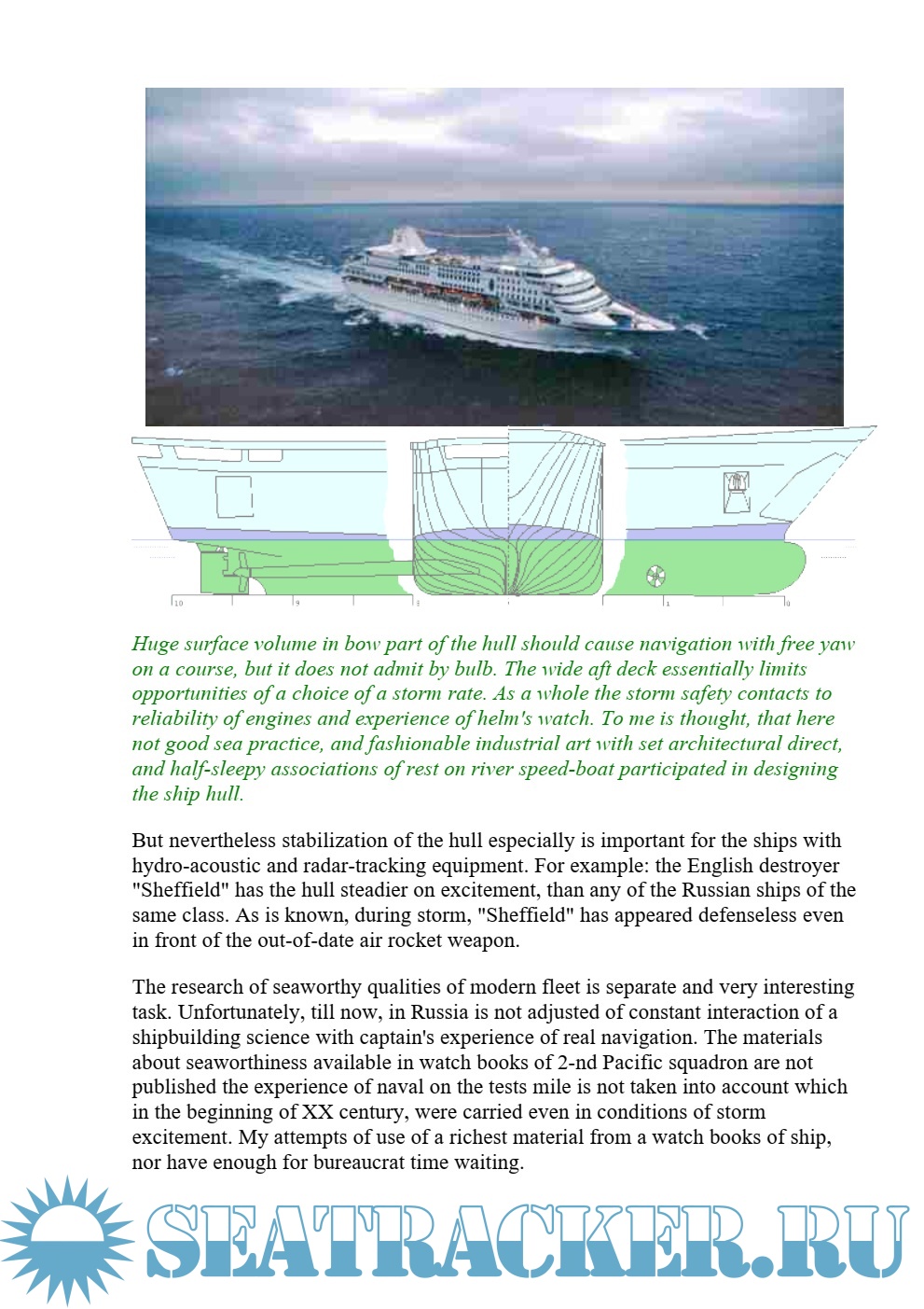 Description: The historical evolution of ship architecture is explained by changes in principles of keeping a motion and only partly by condition of shipbuilding technology. Last thesis is convenient for application to analyze seaworthiness of ship's hull from the most ancient times till the beginning of ХХ centuries. In naval architecture of modern vessels or ships of identical purpose, we can find essential differences in their form of the hull and superstructures, therefore there is interesting realization of the comparative analysis of seaworthy qualities caused by contours of the hull and architecture of superstructures. The urgency of such question is connected with fast changes of ideas about the best form of the hull last decades, but for this period there were no changes in principles of maintenance of seaworthiness or in a way of movement maintenance.