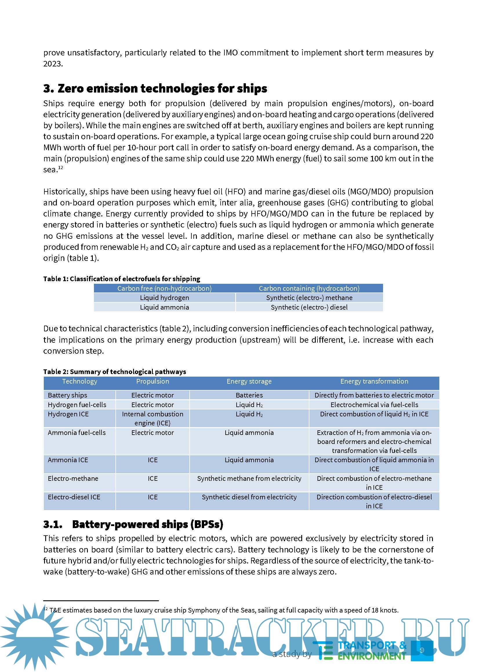 Year: 2018 Language: english Author: European Federation for Transport and Environment, AISBL Genre: Research papers Format: PDF Quality: eBook Pages count: 22 Description: Shipping is one of the largest greenhouse gas (GHG) emitting sectors of the global economy, responsible for around 1 Gt of CO2eq every year.1 If shipping were a country, it would be the 6th emissions, emitting on average 200 Mt/year.2 This report assesses potential technology pathways for decarbonising EU related shipping through a shift to zero carbon technologies and the impact such a move could have on renewable electricity demand in Europe. It also identifies key policy and sustainability issues that should be considered when analysing and supporting different technology options to decarbonise the maritime sector. The basis of the study is outbound journeys under the geographical scope of the EU ship MRV Regulation. We have not tried to quantify the emissions reductions that specific regulatory measures to be introduced at the IMO or EU level might contribute towards decarbonisation by 2050 because there are too many uncertainties. We have taken a more limited first approach and investigated how zero carbon propulsion pathways that currently seem feasible