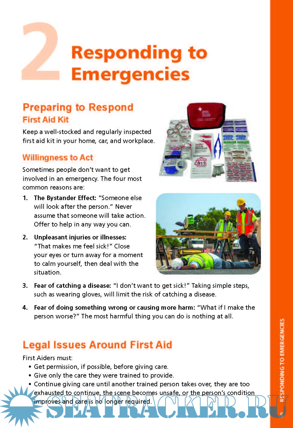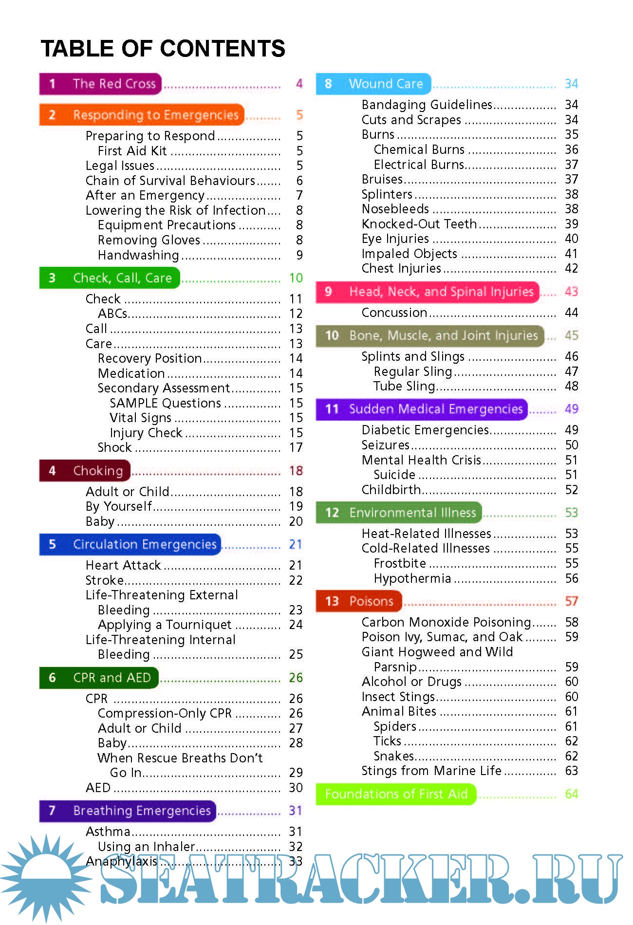 Year: 2017 Language: english Author: The Canadian Red Cross Society Genre: Manual ISBN: 978-1-58480-676-9 Format: PDF Quality: eBook Pages count: 64 Description: Willingness to Act Sometimes people don’t want to get involved in an emergency. The four most common reasons are: 1. T he Bystander Effect: “Someone else will look after the person.” Never assume that someone will take action. Offer to help in any way you can. 2. Unpleasant injuries or illnesses: “That makes me feel sick!” Close your eyes or turn away for a moment to calm yourself, then deal with the situation. 3. Fear of catching a disease: “I don’t want to get sick!” Taking simple steps, such as wearing gloves, will limit the risk of catching a disease. 4. Fear of doing something wrong or causing more harm: “What if I make the person worse?” The most harmful thing you can do is nothing at all.