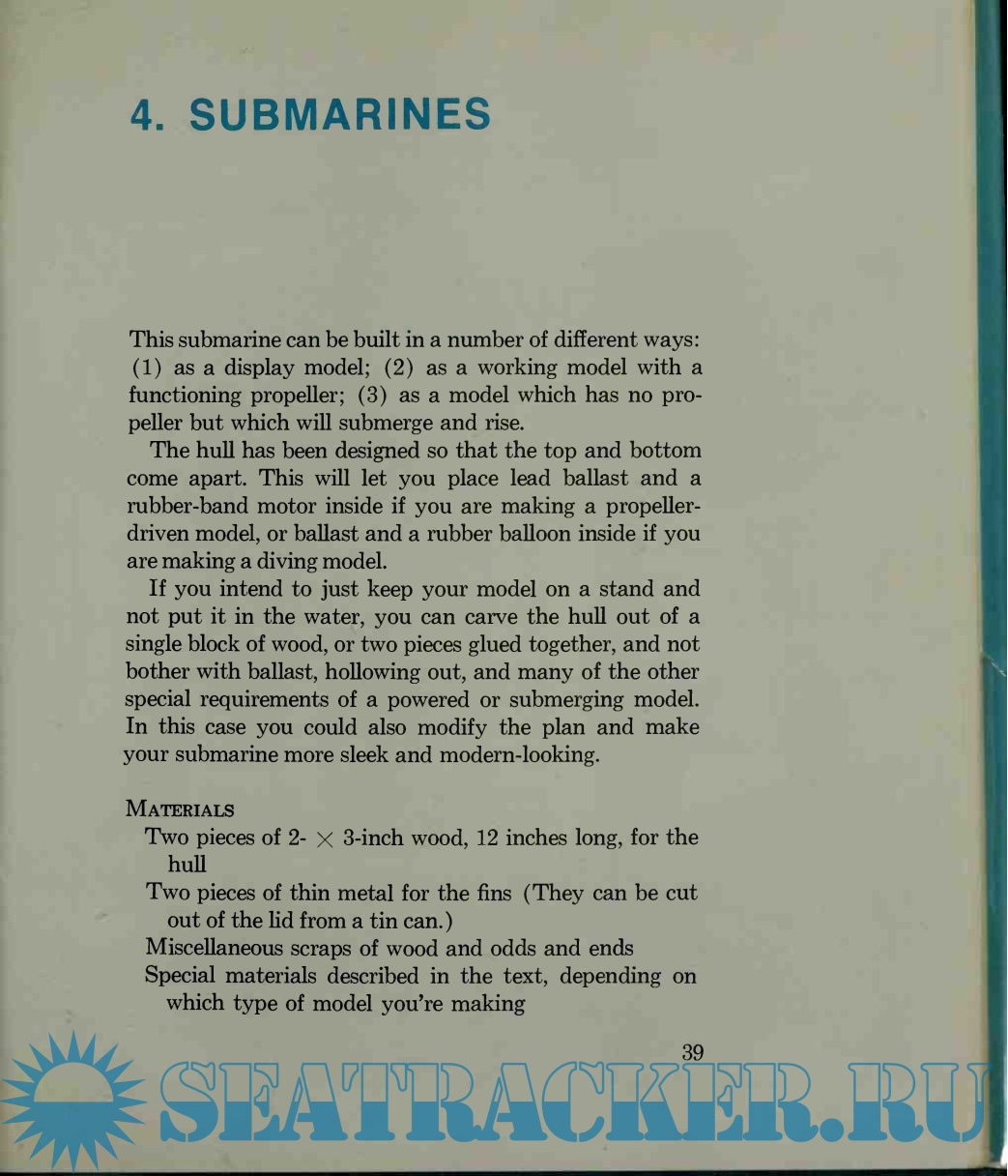 Description: Directions for using simple construction methods and tools to make models of a tugboat, sailboat, stern-wheeler, submarine, and other types of boats.