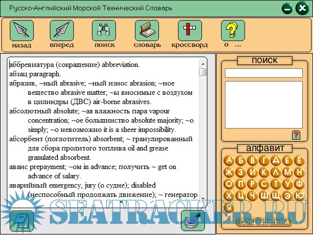 Год выпуска: 2001 Версия: 1.0 Разработчик: - Платформа: PC (Windows) Совместимость с Windows7: да Системные требования: Windows XP/7/8 Язык: русский, английский Язык интерфейса: только русский Таблэтка: Не требуется Описание: Словарь содержит около 25000 слов и терминов относящихся к * морскому делу, * эксплуатации, * классификации, * устройству и оборудованию судов морского флота, * торговым операциям, * морскому праву которые используют в практической деятельности судовые специалисты. Он включает терминологию как техническую, так и правовую, хозяйственную и бытовую, которую необходимо знать работникам на иностранных судах. Словарь рассчитан на широкий круг специалистов, инженерно-технических работников морского флота, курсантов и студентов специальных морских и речных учебных заведений. Все представлено в удобной оболочке. Имеется возможность поиска. + Словарь терминов на 80000 слов.