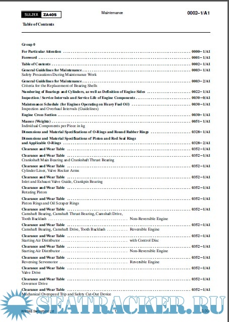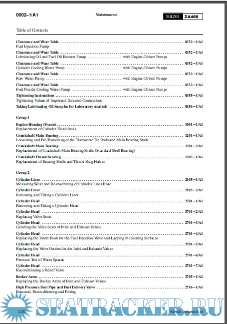 Year: 200? Language: english Author: Wartsila Genre: Manual Publisher: Wartsila Format: PDF Quality: eBook Pages count: 750 Description: The instructions contained in this Maintenance Manual are meant to contribute towards correctly handled mainte- nance work to be carried out at specific intervals. It has been assumed that the staff put in charge of such work possesses the required mechanical knowledge and practice. Indications on the engine operation as well as the description of the function of specific systems are contained in the Operating Instructions. In this manual, you can find also under group 0010---1 and 0040---1 explanation to the lay-out and use of the Operating Instructions as well as of the Maintenance Manual. More detailed instructions on the operation and maintenance of components from sub-suppliers can be gathered from the instruction leaflets of the respective manufacturers. Outside makes are, for example, such engine components which are not manufactured in accordance with drawings of Wärtsilä Italia S.p.A. The Maintenance Manual is subdivided into the following main divisions: --- General guidelines for maintenance --- Maintenance schedule --- Clearance and wear tables, tightening values of screwed connections, masses (weights), seal rings --- Design groups --- Tools list