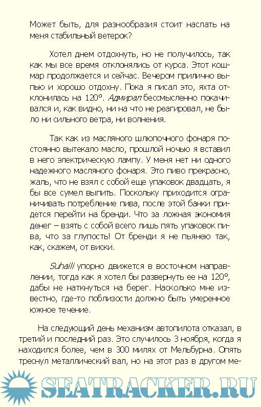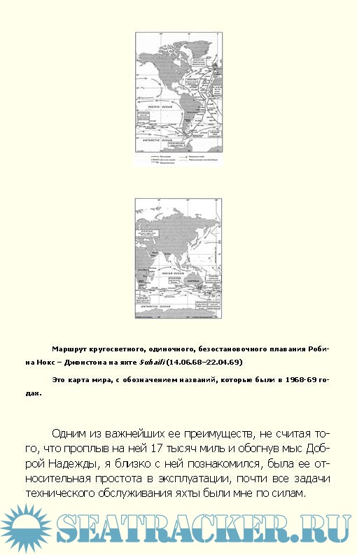 Описание: Если вы хотите узнать, как прожить на маленькой парусной лодке с именем «Suhaili» десять с половиной месяцев, двигаясь к знаменательному достижению во имя своей родины – первому одиночному, безостановочному, кругосветному плаванию на парусной яхте, – то прочитайте эту книгу.С юмором и искренностью автор рассказывает о своем невероятном приключении, в течение которого ему пришлось преодолевать всевозможные искушения сдаться, отказавшись от продолжения борьбы: питьевая вода в баках загрязнилась, гроза вывела радио из строя, самоуправляемый рулевой механизм развалился, гик грот-мачты рухнул, румпель отсутствовал. Тем не менее он отказался сдаваться.Книга Робина Нокс-Джонстона – это увлекательный и вдохновляющий отчет об одном из величайших морских приключений нашего времени.