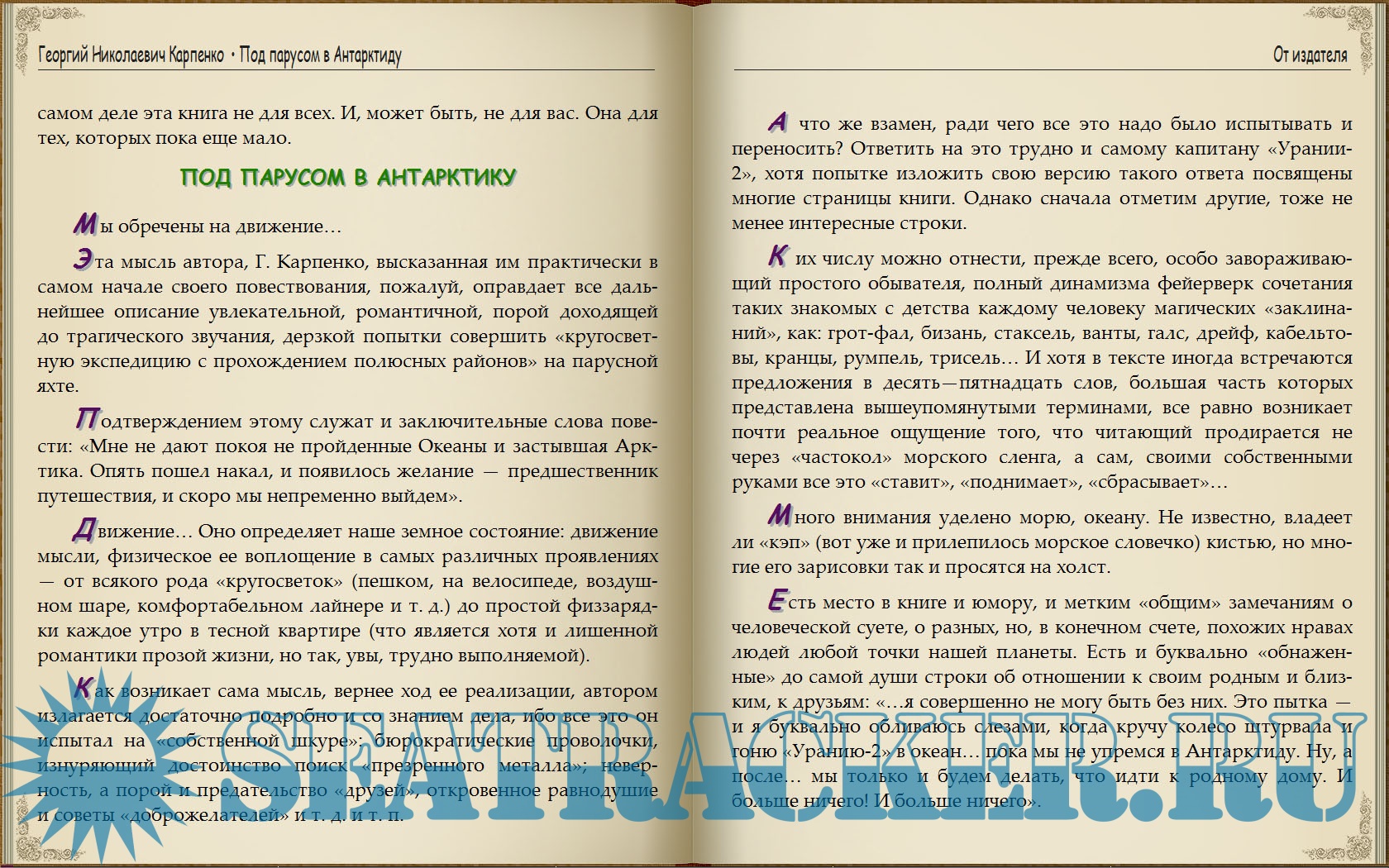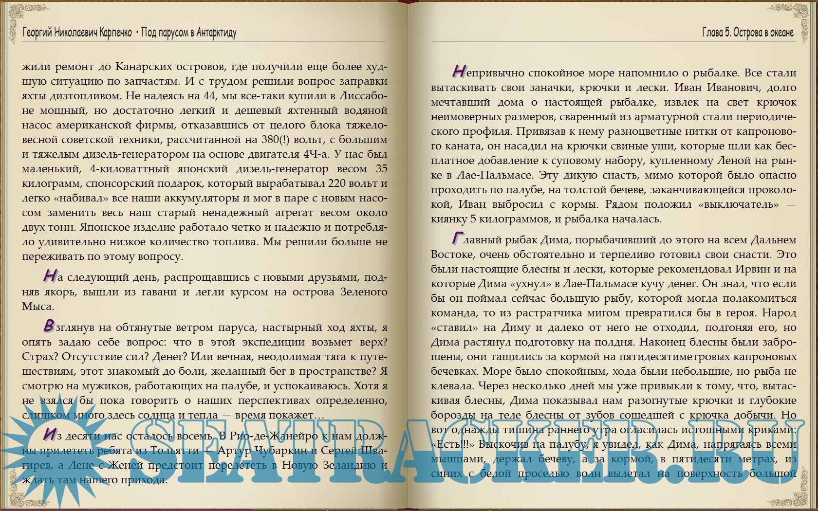 Описание: Девяностые годы прошлого века. Разгар «перестройки». Большинство сограждан занято кто выживанием, кто лихорадочным сколачиванием состояний. В это, вроде бы неподходящее для романтики время, турист с огромным стажем и яхтенный капитан Георгий Карпенко пускает все силы, время и средства на строительство огромной стальной океанской яхты — «Урании 2», после чего, набрав команду по… объявлению в журнале, уходит из Питера курсом на Антарктиду. С огромными трудностями, оказавшись к моменту старта на финансовой мели, Георгий приводит яхту к берегам южного континента и даже пытается «замкнуть» кругосветку в меридиональном направлении. О перипетиях этого похода и рассказывает данная книга. Очень познавательное, эмоциональное и светлое чтение, книга, которую хочется перечитывать снова и снова.