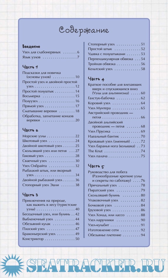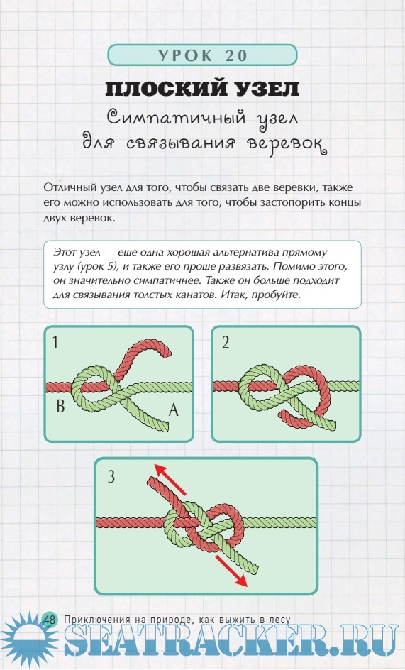 Описание: Отложите свои ноутбуки и возьмите в руки эту замечательную (тупую книгу с "транслайтным" переводом, которая безграмотно перевела название базовых узлов с английского) книгу, которая расскажет вам, как завязать 50 жизненно необходимых узлов. Если вы не в курсе, в чем разница между рымным (нет такого узла - есть "полусхват") и свайным (нет такого узла - есть "сваечный") узлом или между самозатягивающимся беседочным узлом (правильнее - "Булинь") и прямой перевязкой (а это ещё что такое?), узнайте все в этом издании (оно запутает вас окончательно!). С помощью пошаговых инструкций, научитесь вязать узел, который выручит вас в любой ситуации. И неважно, идет ли речь о морских узлах для плавания или петель для кэмпинга и походов. Вы изучите технику простых узлов, которые помогут вам в ваших начинаниях. Когда вы освоите азы, вы сможете попробовать более сложные задачи, например, своими руками сделать уздечку, чтобы приручить дикого зверя или связать крепкими узлами предметы. Но будьте бдительны, это вызывает привыкание! (Авторам перевода моё пожелание - похмелитесь, прежде чем выпускать подобные книжки! Жуткий перевод совершенно нормальной книги Аллена Марти - Marty Allen "50 knots you need to know").