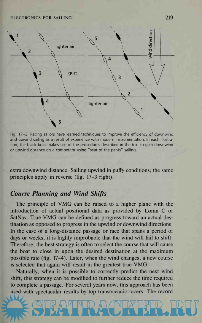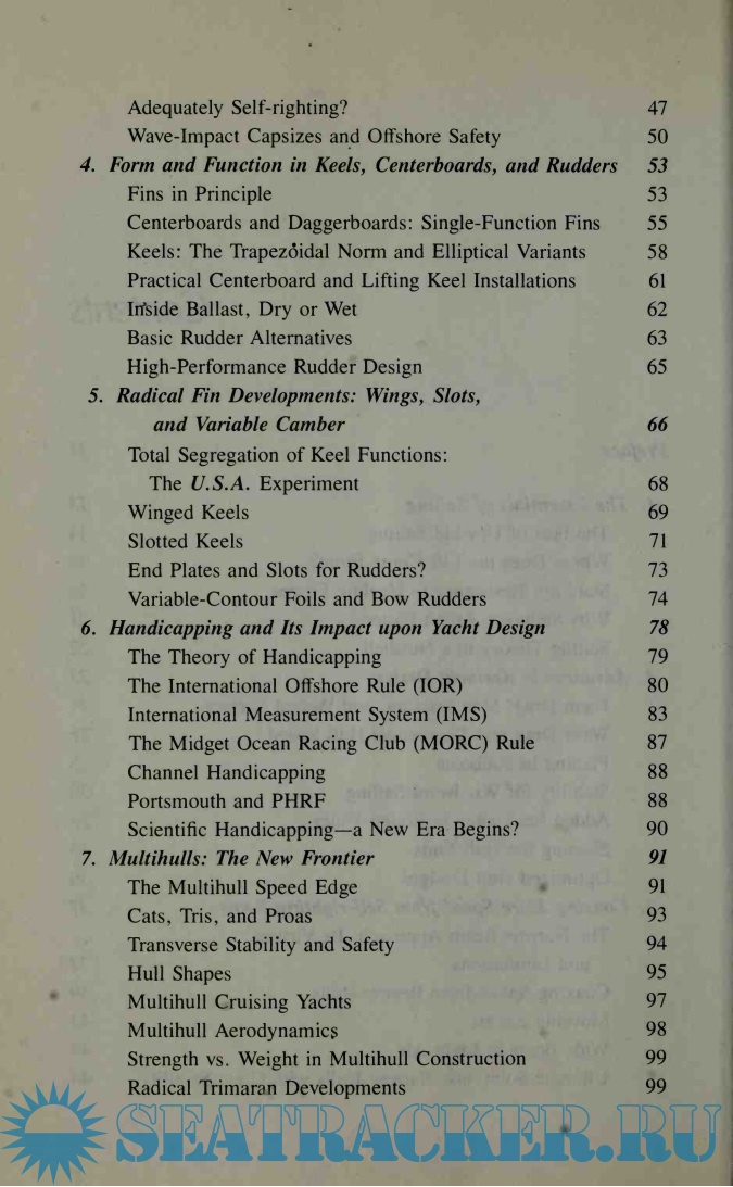 Year: 1990 Language: english Author: Donaldson S. Genre: Guide Publisher: G.P. Putnam's Sons ISBN: 0-399-13506-5 Format: PDF Quality: Scanned pages Pages count: 241 Description: The accelerated pace of technological advancement in sailing today is viewed by most amateur sailors as either exciting or alarming, but few are genuinely indifferent to the rapid changes in our oncetraditional recreational pursuit. There is little doubt that those who deplore these changes will eventually have to reconcile themselves to them. The escalating political and economic importance of major transoceanic races, Olympic competition, the America's Cup, and the recent emergence of full-fledged professional racing serve notice that the pace of sailboat development is certain to continue fast and furious. This book is intended to help the casual recreational sailor come to grips with (and, I hope, appreciate a bit more) the leading edge of sailing technology. It undertakes to show how recent developments fit into a framework of fundamental principles and how the latest innovations build upon the best technology of an earlier era. It is not intended as an encyclopedic guide to everything that's new in sailing, but rather as an introduction for those who would like to know a little more about how contemporary boats really work. Aficionados of automobile racing like to point out that many major improvements in automotive engineering originated on the track. The same argument when applied to sailing is equally compelling. Over the past thirty years a majority of the advances in sailing hull design, construction, rigging, spars, and sails were pioneered on the racecourse. In a remarkable number of cases, the inventions inspired by competition have ended up being used on many, if not most, recreational sailboats. For this reason alone, no one with a genuine interest in sailing can ignore the progress currently being made by serious racing sailors, designers, boatbuilders, and sailmakers. If history shows any inclination to repeat itself, the cruising and daysailing boats of the next decade will incorporate many of the ideas being tested and refined by today's racing sailors, particularly those who compete offshore and shorthanded. Thus, while this is not a book about sailboat racing, racing is indirectly responsible for much of its content. I make no apologies for this, and sincerely hope that even those of you who consider yourselves dyed-in-the-wool cruisers will elect to read on.