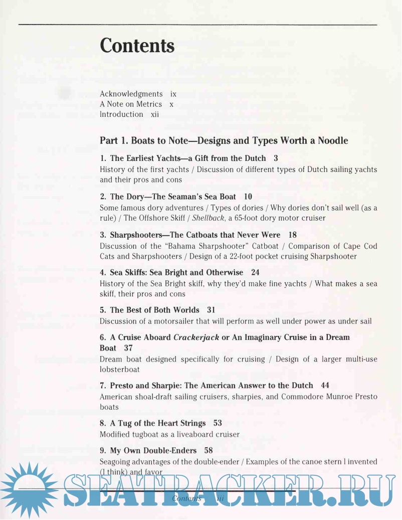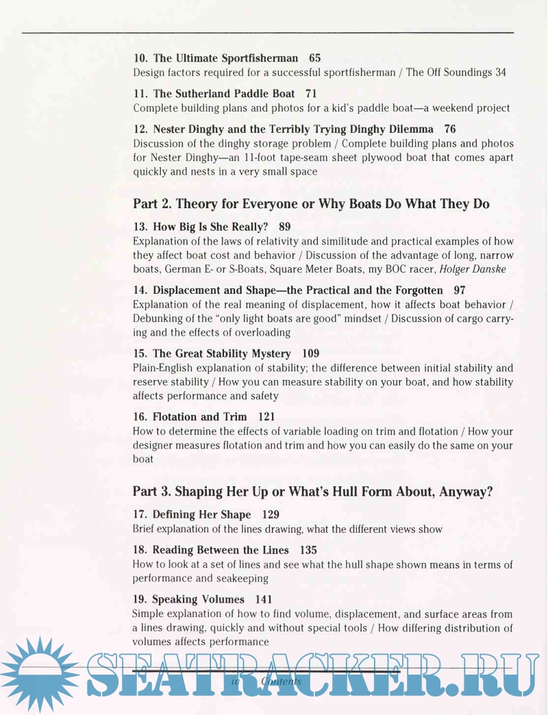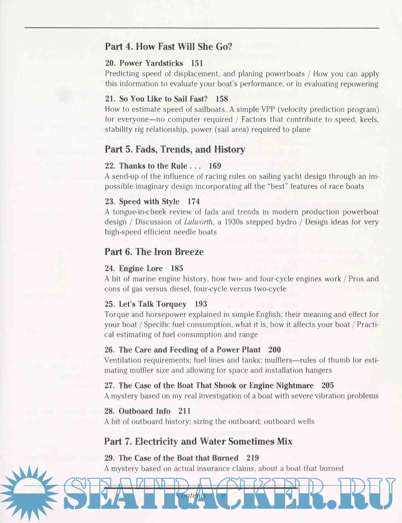 Year: 1991 Language: english Author: Gerr D. Genre: Guide Publisher: International Marine Publications Co ISBN: 0-87742-289-3 Format: PDF Quality: Scanned pages Pages count: 424 Description: Boat noodling. Boat lovers suffer universally from this benign affliction. In its mildest form boat noodling is nothing more than wondenng why that sloop in the next slip is faster than yours. In a more senous manifestatiori it could mean senous daydreaming — drifting off for extended penods, sketching design ideas on the back of an envelope. Chances are, if you’ve picked up this book just to see what’s in it, you’re beyond help. Naval architect Dave Gerr offers the perfect antidote, a browser’s reference to understanding how boats tick: all you’ve ever wanted to know about boats — power and sail, race and cruise, dinghy and megayacht. In the clear, friendly, nontechnical style that has made his column for Offshore magazine so endunng and popular, Gerr explains everything from how thick a hull should be to why one sailboat tips less than another, from choosing an engine to designing a rig for your trawler yacht, from building a dinghy to simple rules of thumb for dozens of design quandanes. Gerr wntes for the boot noodler in us all — those senously interested in learning and dreaming about all types of watercraft. There is no better way to become a better seaman, equipped to handle any contingency. And there’s no better place to start than right here.
