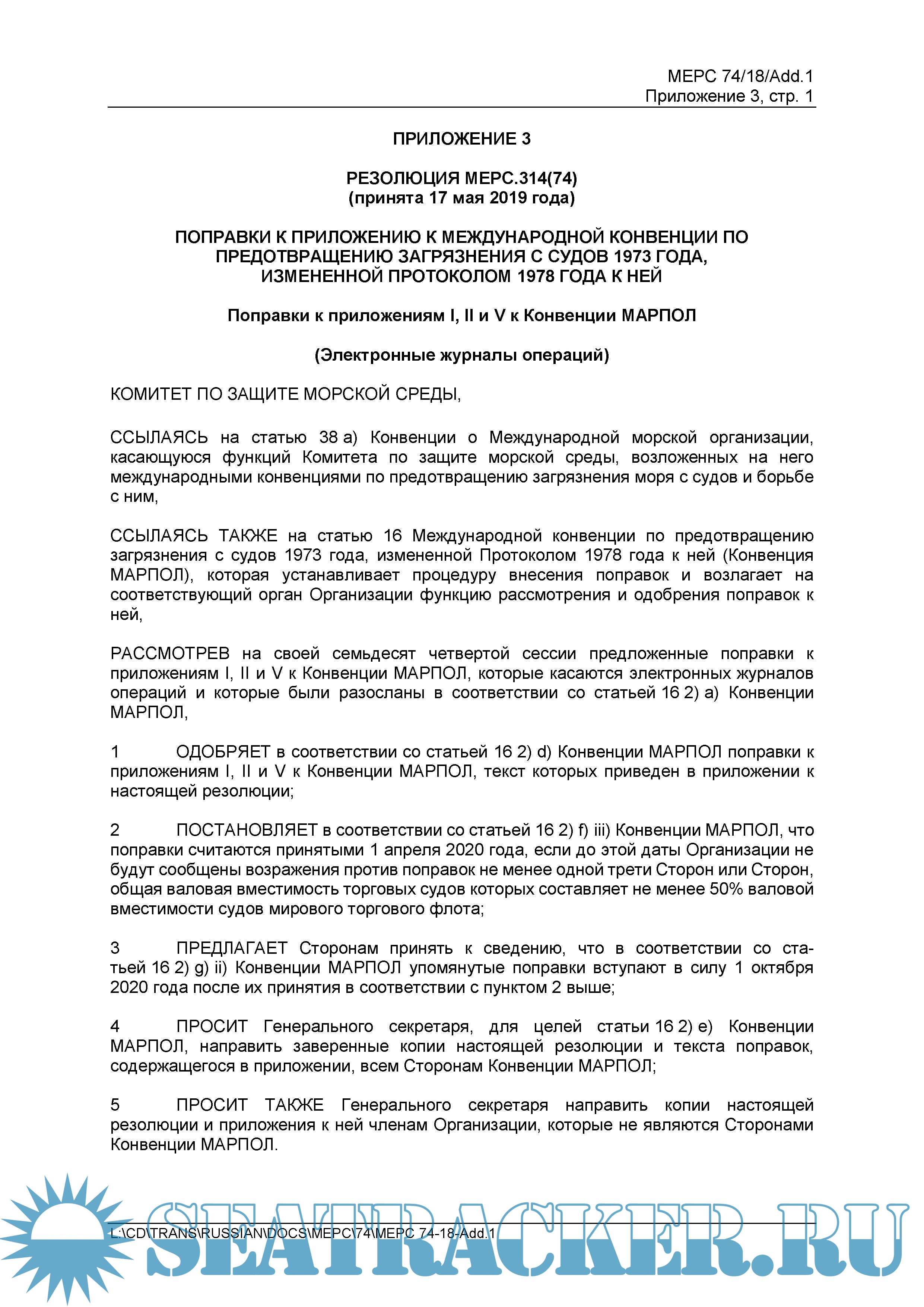 Поправки к Приложению к Международной Конвенции по Предотвращению Загрязнения с судов 1973 года, измененной Протоколом 1978 года к ней (Резолюция MEPC.314(74)) = Amendments to the Annex of the International Convention for the Prevention of Pollution from ships, 1973, as modified by the Protocol of 1978 relating thereto Amendments to MARPOL Annexes I, II and V (Resolution MEPC.314(74))
