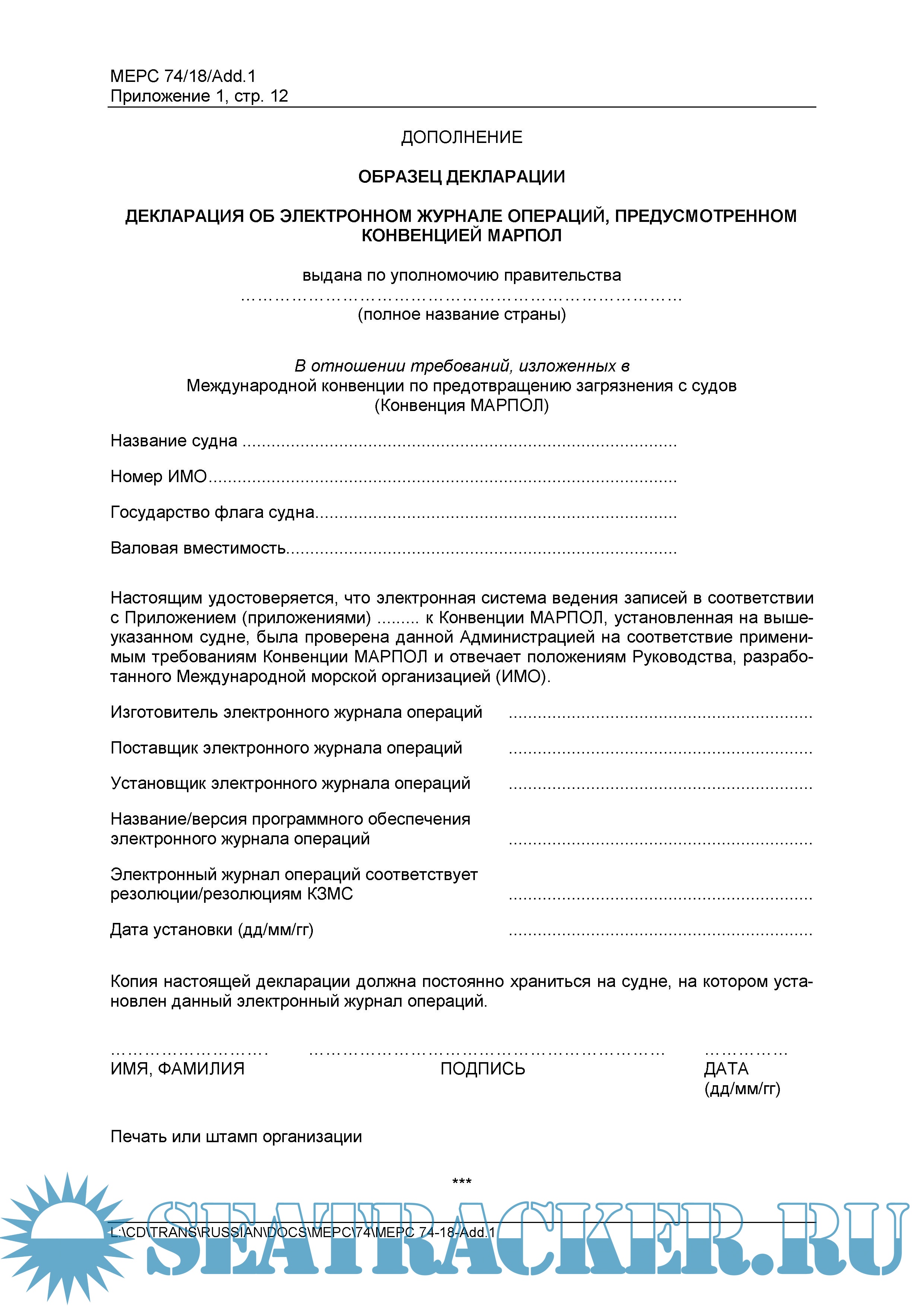 Год выпуска: 2019 Язык: русский Автор: ИМО КЗМС (MEPC) Жанр: Руководство Издательство: International Maritime Organization Формат: PDF Качество: Неизвестно Количество страниц: 12 Описание: Руководство по использованию электронных журналов операций согласно Конвенции МАРПОЛ (Резолюция MEPC.312(74)) = Guidelines for the use of Electronic Record Books under MARPOL (Resolution MEPC.312(74)) Доп. информация: СОДЕРЖАНИЕ 1 ВВЕДЕНИЕ 2 ПРИМЕНЕНИЕ 3 ОПРЕДЕЛЕНИЯ 4 СИСТЕМНЫЕ СПЕЦИФИКАЦИИ 5 ДЕКЛАРАЦИЯ 6 ИНСПЕКЦИОННЫЕ ПРОВЕРКИ И ОБЕСПЕЧЕНИЕ СОБЛЮДЕНИЯ ТРЕБОВАНИЙ КОНВЕНЦИИ МАРПОЛ ДОПОЛНЕНИЕ. ОБРАЗЕЦ ДЕКЛАРАЦИИ