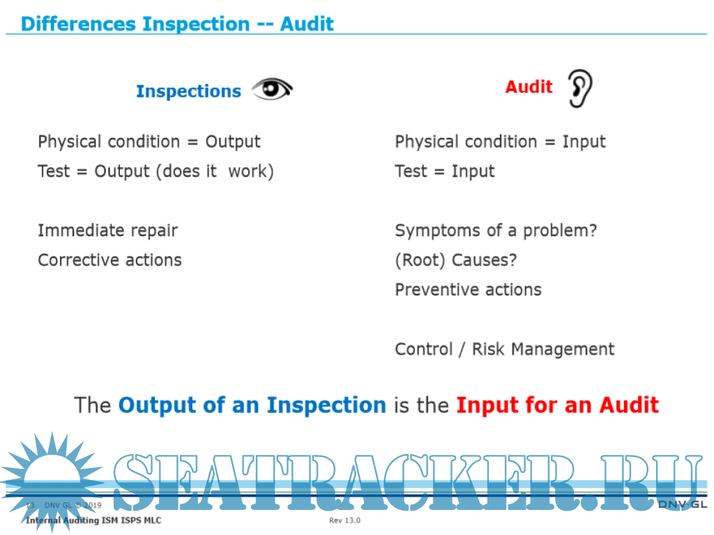 Description: Effective implementation and verification of a (safety) management system require periodical internal audits. The approach to and scope of an audit differs widely from an inspection.