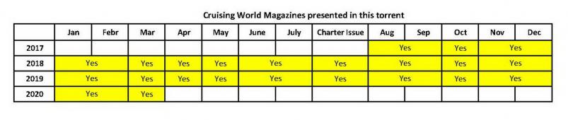 Year: 2017-2020 Language: english Author: Mark Pillsbury - editor Genre: Periodical (magazine) Publisher: Bonnier Corporation Format: PDF Quality: Photo of pages Pages count: 100-170 Web: https://www.cruisingworld.com/ Description: Cruising World is your passport for exploring the world’s coastlines and oceans while voyaging under sail. Its contributors inspire and entertain through stories, pictures and videos that underscore the beauty and adventure of sailing, while providing instruction on the disciplines of seamanship, navigation and boat handling. The Cruising World community is made up of experienced, committed sailors and boat owners. No matter their long-range sailing plans, Cruising World’s mission is to nurture their dreams with practical how-to information and stirring real-life adventure features.