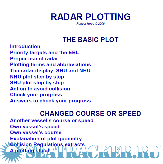 Year: 2008 Language: english Author: Ranger Hope Genre: Textbook Publisher: Range Hope Format: PDF Quality: Scanned pages Pages count: 42 Description: A derivative of the Radar Workbook, but with more explanation. Radar Plottex is a simple made book with in-detail explanation on how to maneuver and how to calculate Target Elements on the plotting sheet. It will help to many students in all Naval universities, and hopefully on the ship! Additional info: Good luck :3