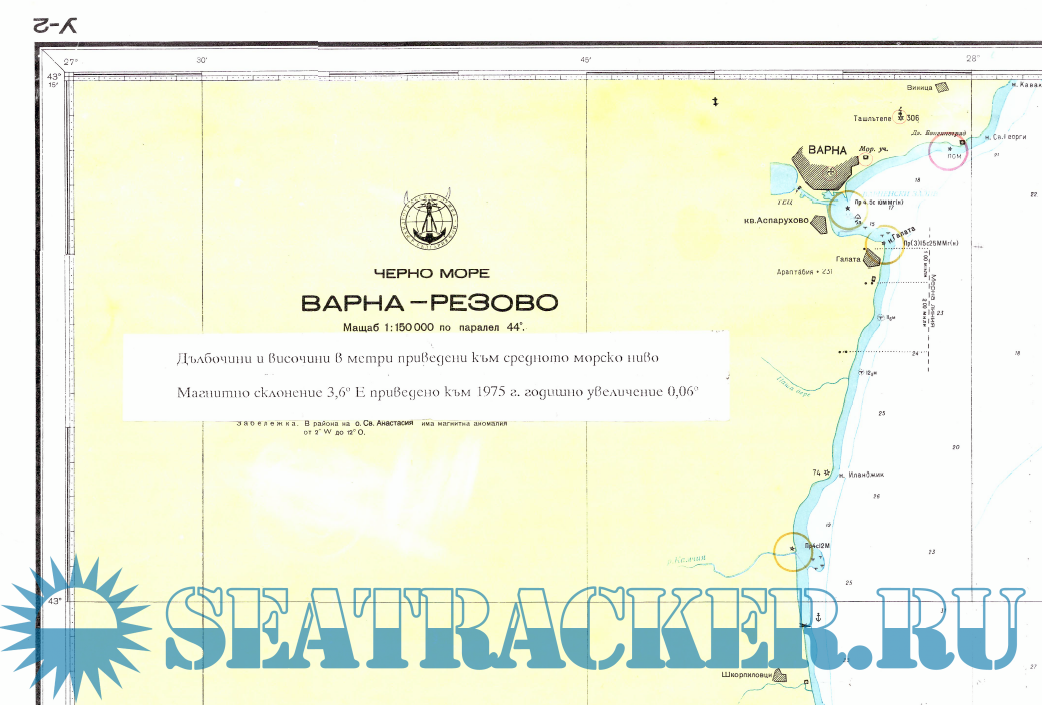 3. The title of the chart(in bulgarian) - Varna - Rezovo. The scale at parallel 44°, the magnetic declination for year 1975 with the increasement per year.