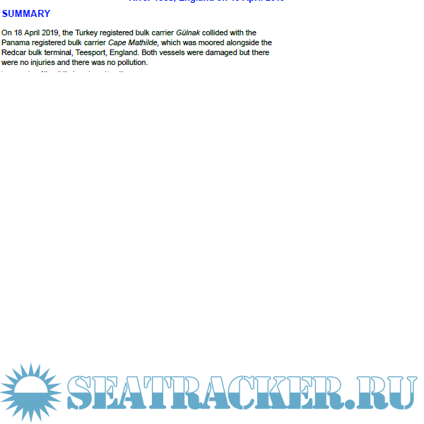 Description: Accident Investigation report for Collision between the bulk carrier Gülnak and the moored bulk carrier Cape Mathilde River Tees, England on 18 April 2019
