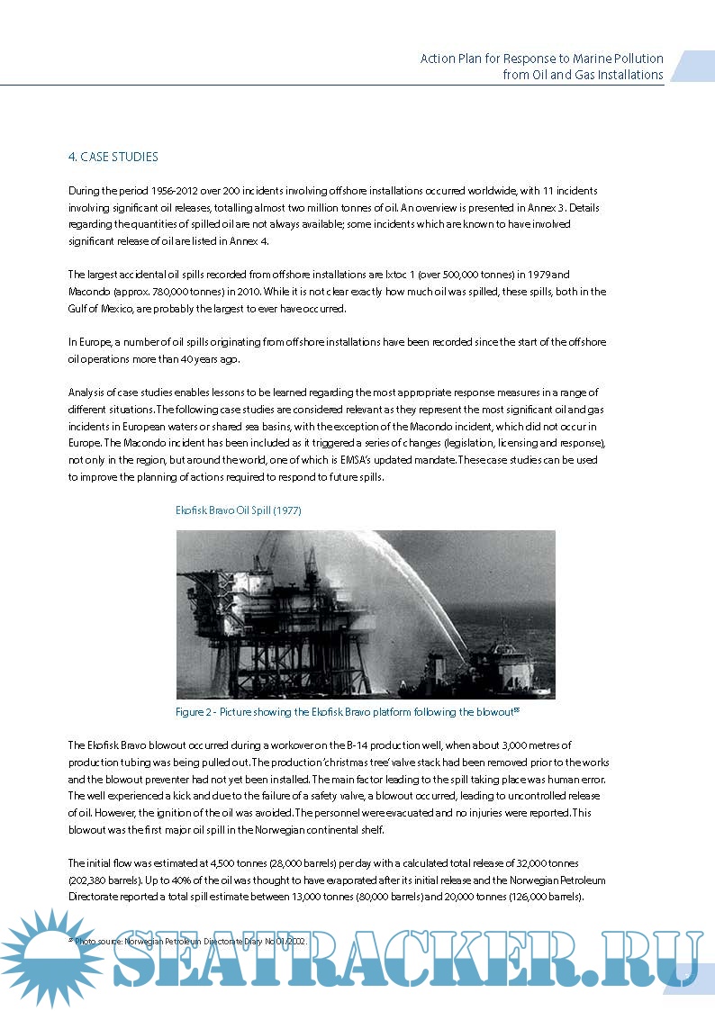 Year: 2014 Language: english Author: EMSA Genre: Research papers Publisher: European Maritime Safety Agency Format: PDF Quality: eBook Pages count: 84 Description: EMSA's Action Plan covers the response to oil pollution caused by offshore installations. The response to pollution caused by gas installations is not addressed due to the particularities of such incidents. EMSA's expertise and response capabilities are primarily focused on oil pollution in the marine environment. Gas emissions may include liquid condensates, which evaporate into the atmosphere, with limited residues persisting on the water surface, meaning that on-site recovery is not feasible. However, gas plumes from gas installation incidents can pose a significant hazard to responders and EMSA will therefore explore monitoring options for oil and gas incidents, taking into consideration recent technological advances in this area. The Action Plan provides: - an overview of international and regional regulatory and cooperation structures for pollution response, addressing offshore installations in particular; - information regarding particularities and challenges of pollution caused by offshore installations and response measures to marine pollution caused by such installations, including some case studies; - a brief overview of both Member States' and oil industry's preparedness and response activities regarding oil pollution caused by offshore installations; and - an array of proposed activities by the Agency in the fields of operational assistance, cooperation and information. The activities proposed in the Action Plan shall be implemented on a step-by-step basis through the Agency's Annual Work Programmes, following the approval by the Administrative Board. The actual timing and extent of its implementation are dependent on the available financial resources as well as the levels of support and participation from both Member States and the oil industry. Nonetheless, EMSA intends to build up an appropriate 'reserve for disasters' by adapting its current capabilities and developing new ones.