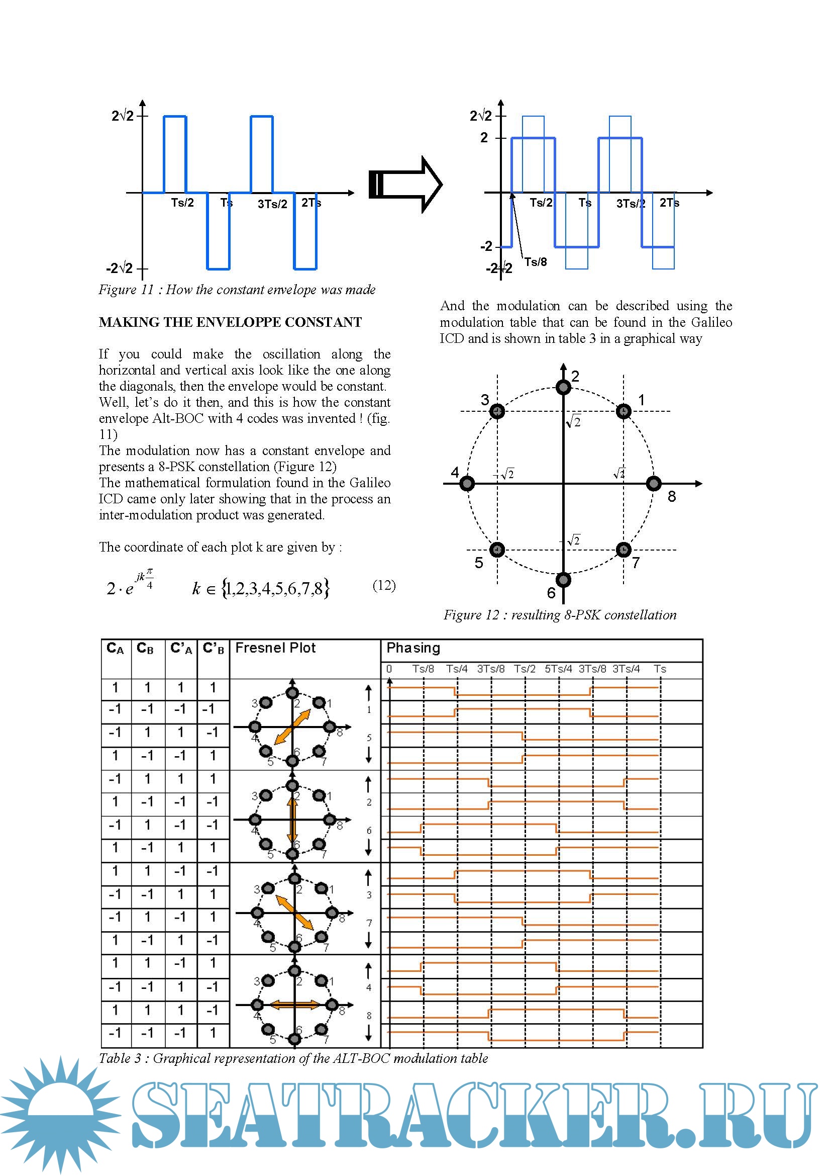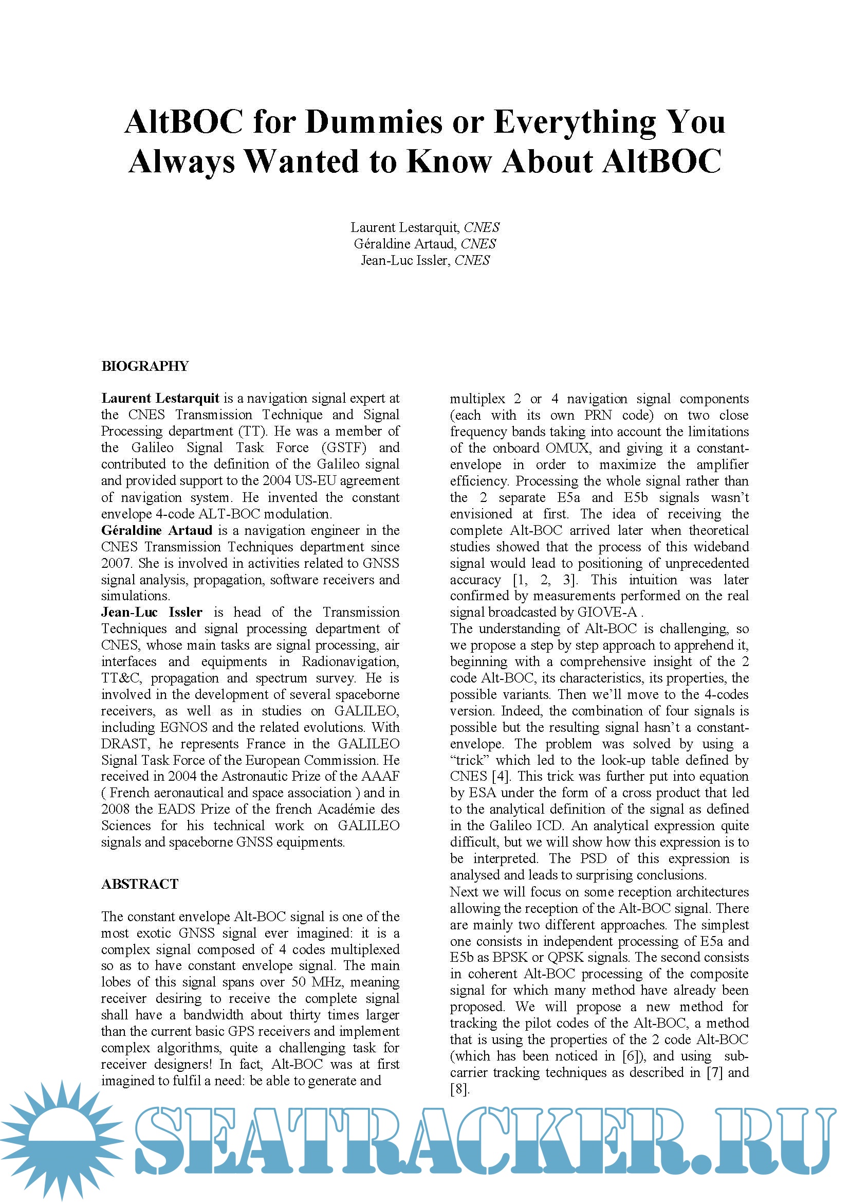 Description: Alt-BOC is a modulation whose understanding require strong efforts. The mathematical formulation and the equivalent look-up table provided in the GALILEO SIS-ICD are not strait-forward. Written by its inventor, the purpose of this paper, is to help navigation engineers in understanding Alt-BOC or we should say, understanding the numerous Alt-BOC variants, explaining how the constant envelope Alt-BOC was invented, and highlighting its properties. An accurate definition was given in : “ An Alternative-BOC signal is a BOC-like signal having different PN codes in the lower and the upper main split lobes. Alternative-BOCs allow one signal service per lobe.”