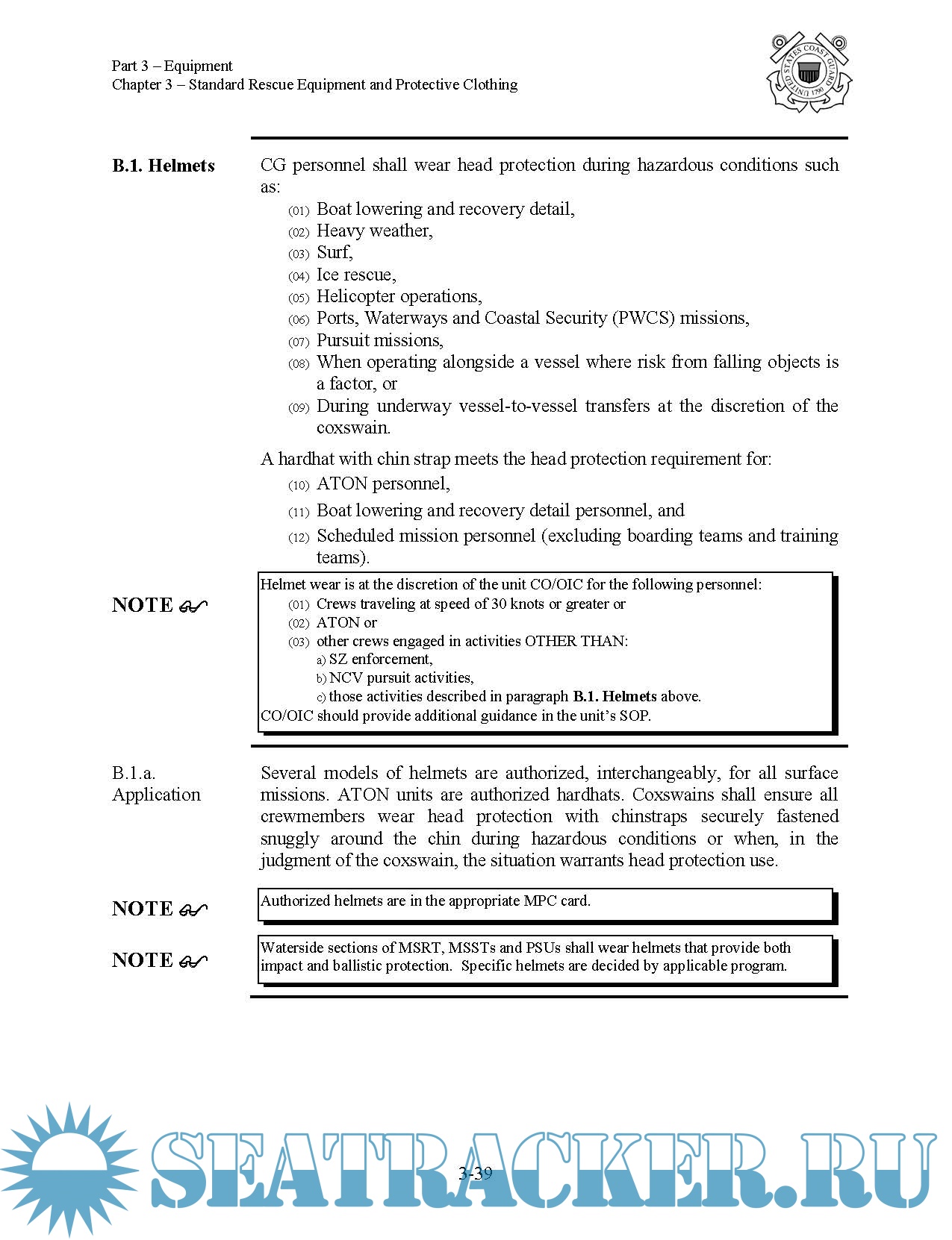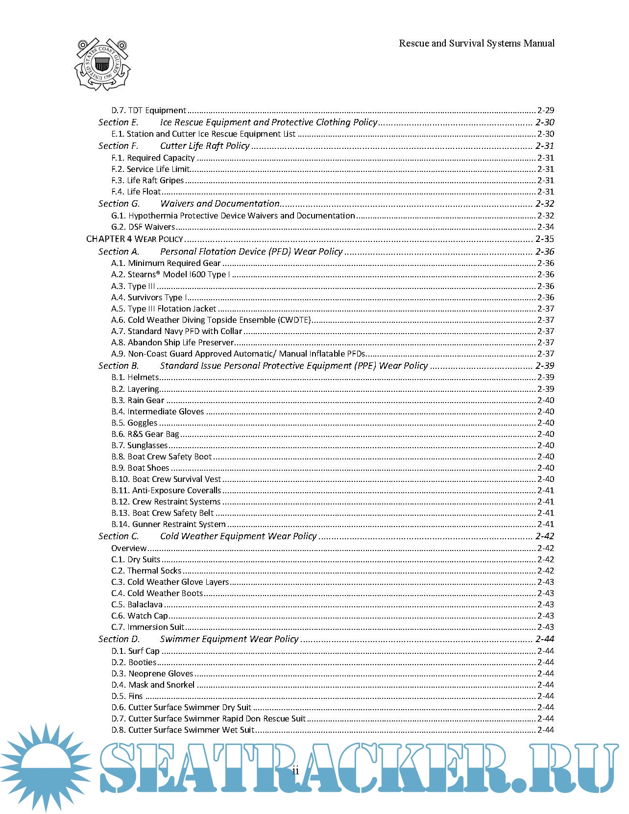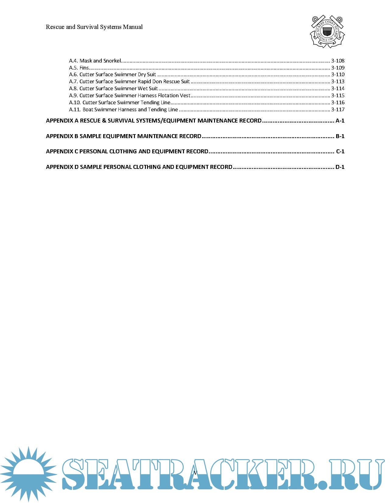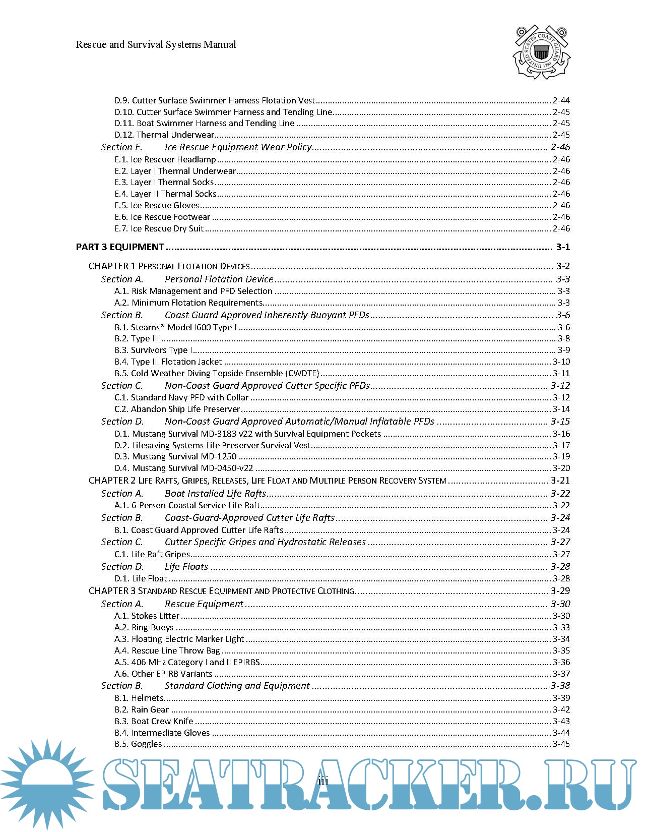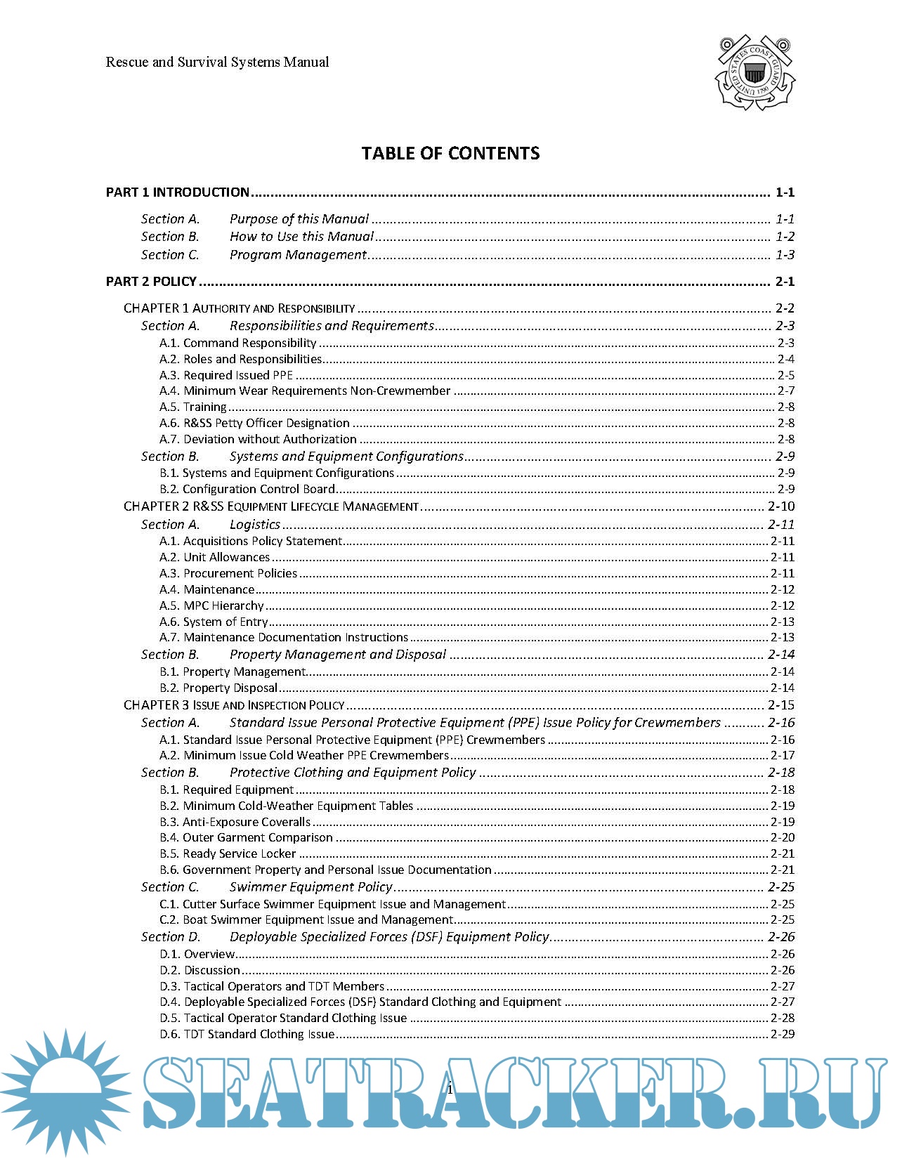 Description: This Manual establishes policy, equipment standards, procedures and procurement authorization for the use, configuration, maintenance and logistics of rescue and survival equipment used by United States Coast Guard personnel operating on or near the water.