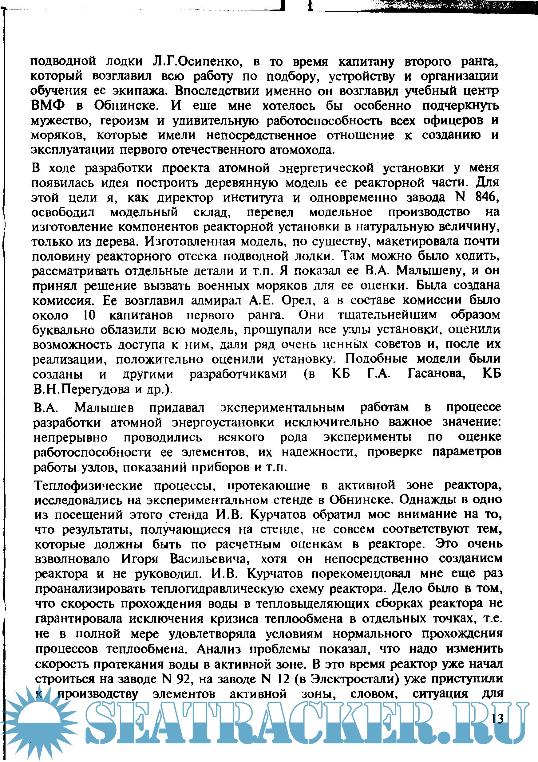 Описание: 27 октября 1995 г. - в день рождения академика Николая Антоновича Доллежаля - авторы незадолго до этого вышедшей в России книги "Атомная подводная эпопея" Л.Г.Осипенко, Л.М.Жильцов и Н.Г.Мормуль подарили ее Николаю Антоновичу - главному конструктору первой в стране атомной энергетической установки для подводной лодки. Высоко оценив содержание книги, Н.А.Доллежаль решил поделиться своими воспоминаниями о том этапе работ по первой АПЛ, который предшествовал событиям, описываемым в книге. Вам предлагается запись этих воспоминаний, представляющих особый интерес в год 300-летия Российского Флота.